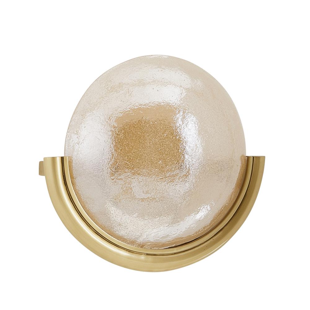 Classic and bold, this chic slump glass dome in champagne seedy, delivers timeless intrigue. Framed by a support in antique brass iron that effortlessly anchors the glass like a precious stone. Damp-rated, although limited covered outdoor conditions may affect finish. Finish will vary.