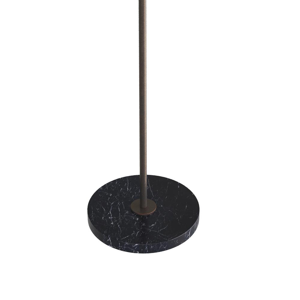 This essential piece offers a clean and contemporary update of a classic lantern shape. Anchored by a slender rod and chattered cuffs of English bronze, the unlined shade of white linen diffuses the light beautifully. Finished with a circular base of black marble and matching black cloth cord. Full-range dimmer.