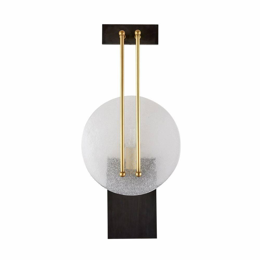 The strings of instruments such as a violin or banjo inspired the clamped and pierced structure of the Clover. Held by accents of antique brass-plated steel, a disc of clear seedy slump glass diffuses a single bulb. Mounted on double bronze steel panels, it is an ideal mix of material and shape.