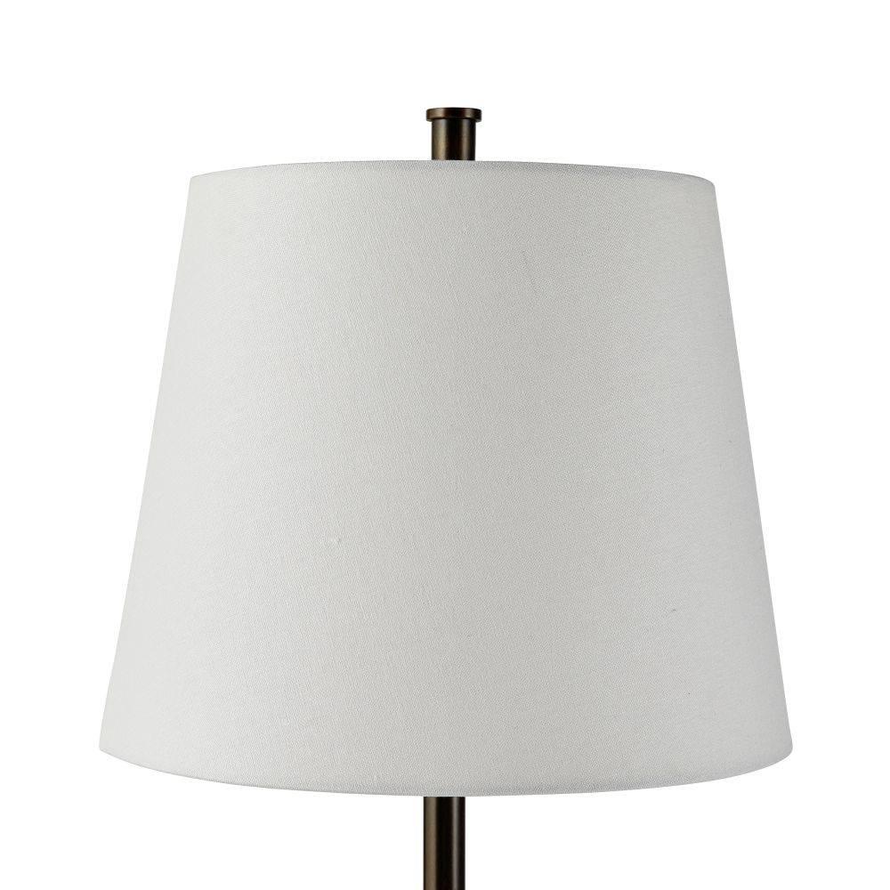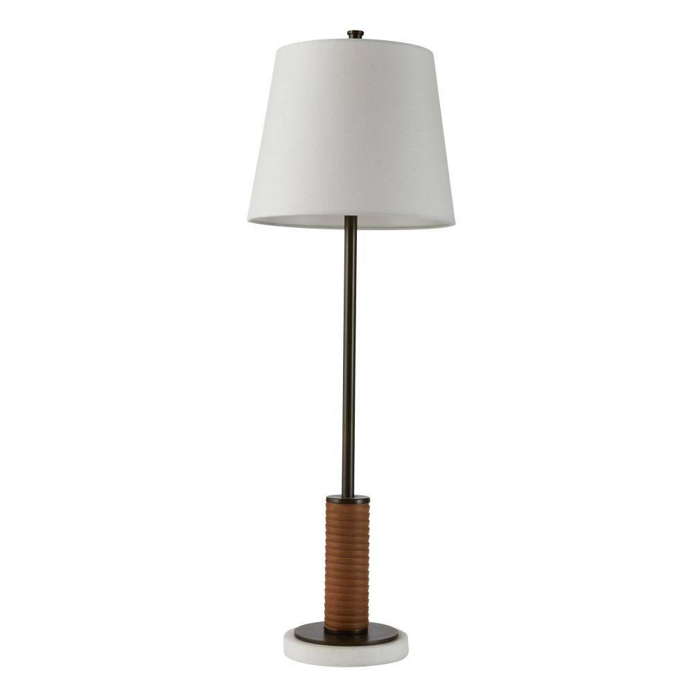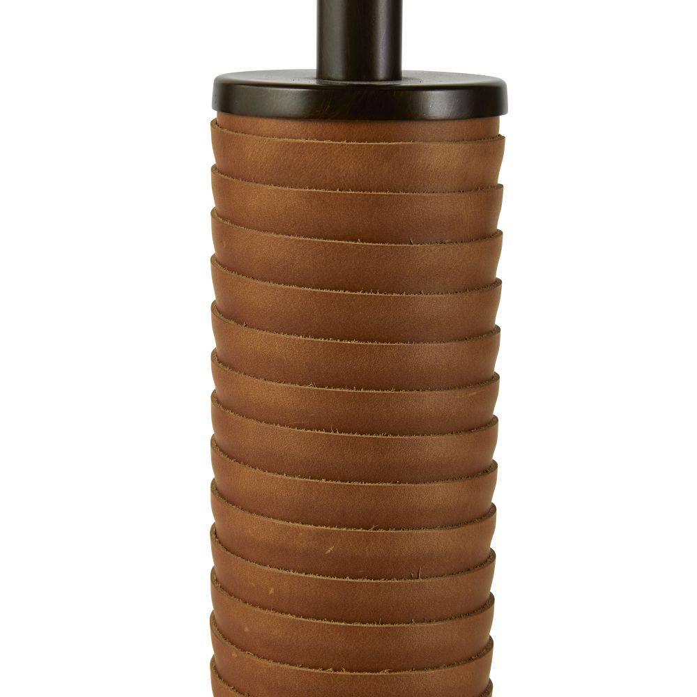 Fine cognac leatherworking and a taller silhouette makes the Conway ideal for a gentleman’s lounge, console, or buffet. Both masculine and modern, this English bronze frame is anchored to a base of white marble for a sophisticated contrast. White linen drum shade and taupe cloth cord.