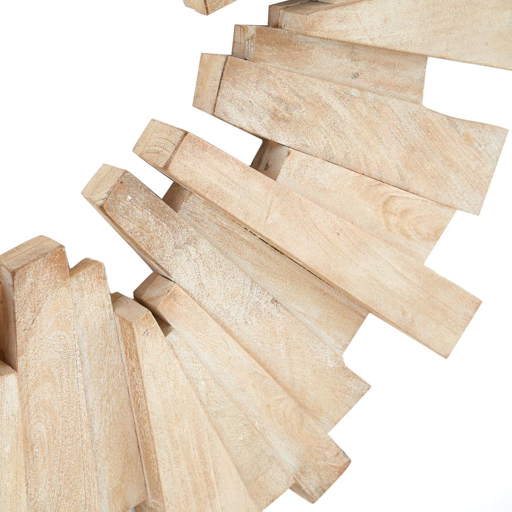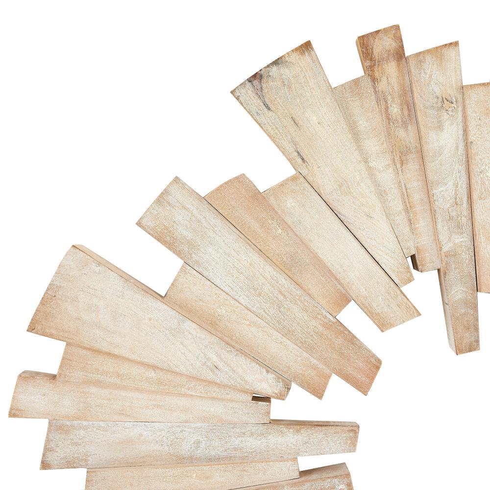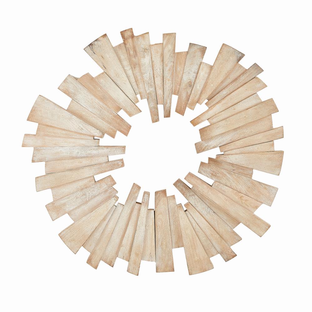A sandblasted round of lime-washed mango wood adds an explosive impact to any wall. Crafted with a stacked sunburst shape to add dimension and laminated for durability, this chic accessory can be displayed all four ways. A D-ring attachment assures secure hanging. Finish will vary.