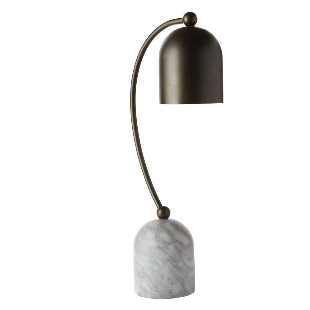 The stylish sculptural lines of our table lamp embody the classical forms of elemental geometry. A bell-shaped shade of English bronze plate finds its sculptural match in a gray flower marble base. Taupe cloth cord. Finish will vary.
