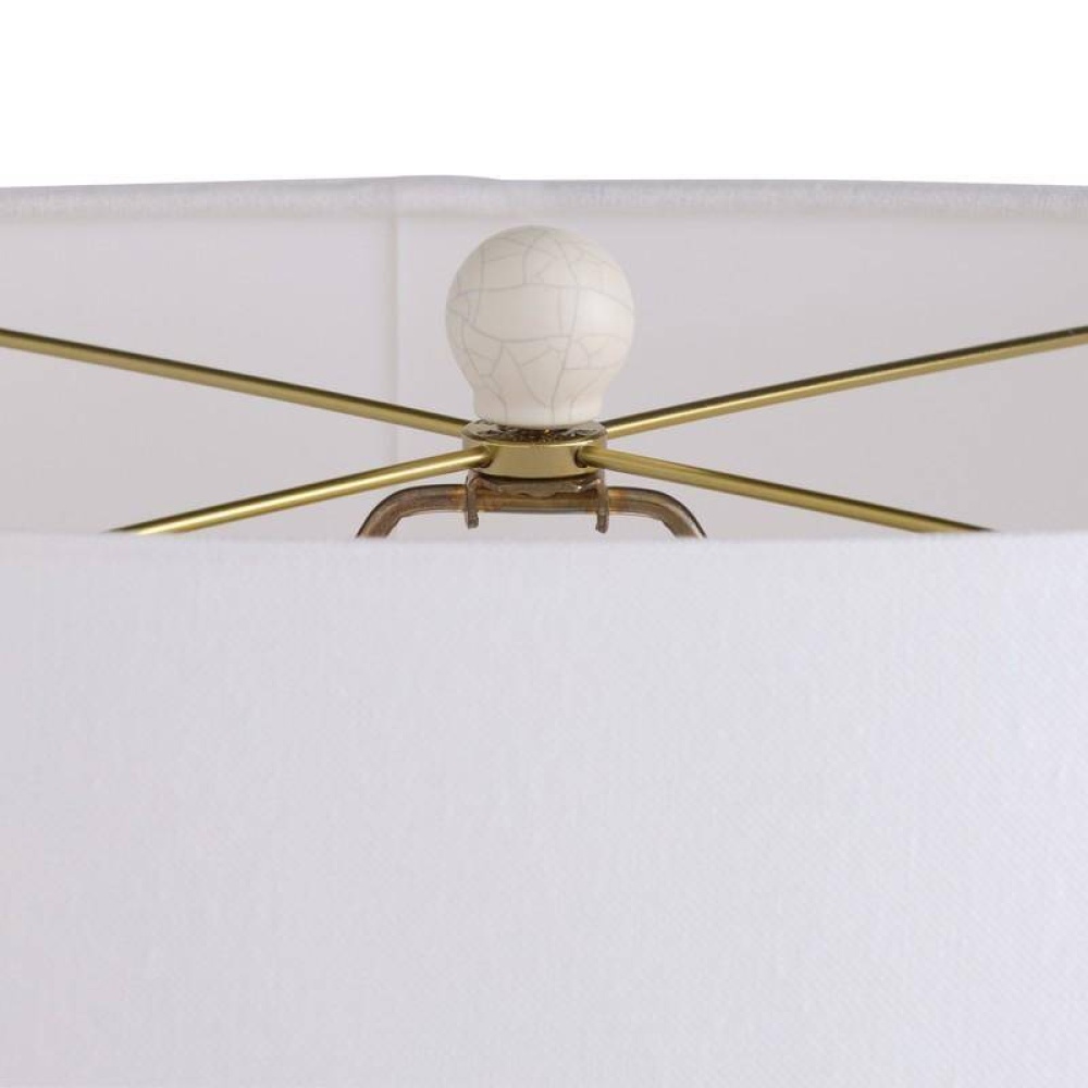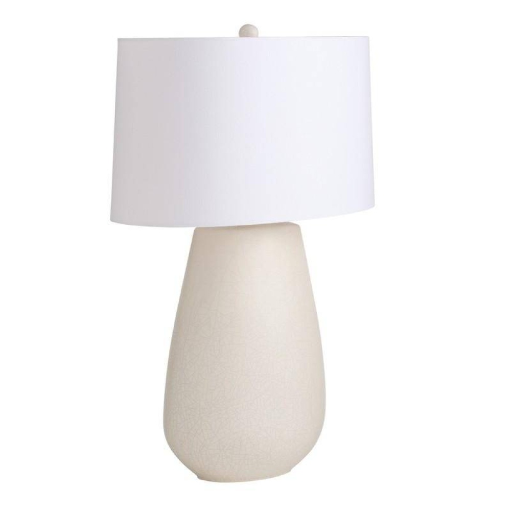 A more neutral interpretation of one of our favorite silhouettes, the porcelain Deagan is finished with a subtle matte ivory crackle glaze and a matching finial. Topped with a white linen oval drum shade lined in white cotton. Finish will vary.