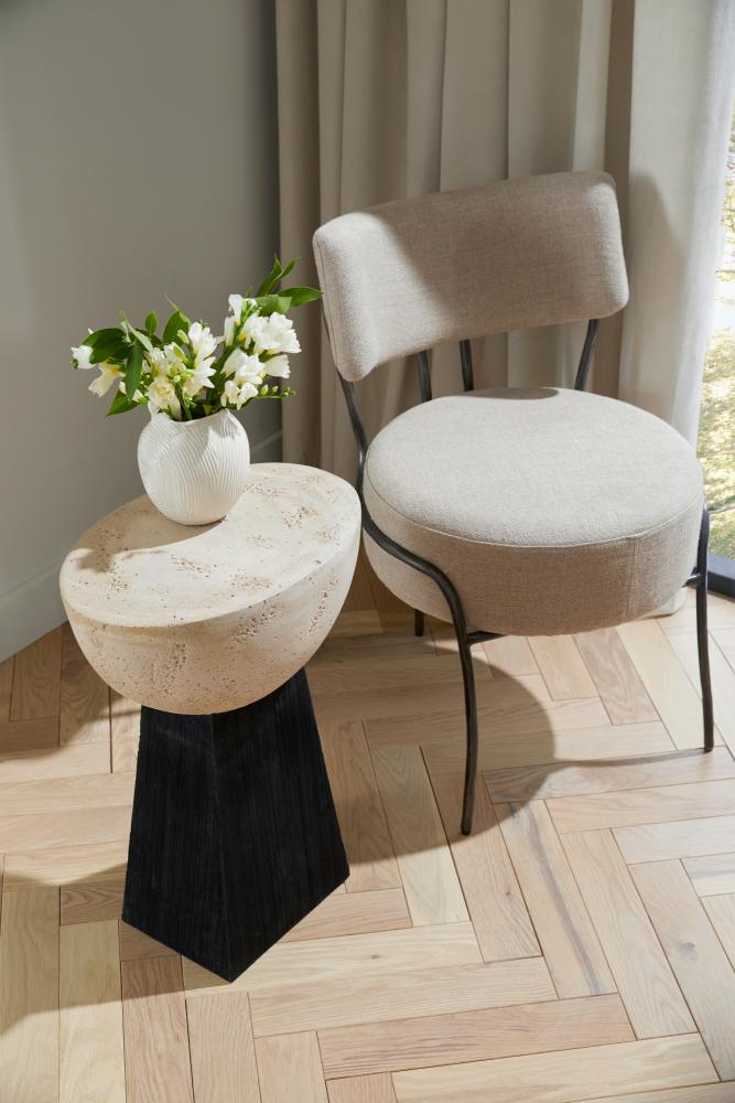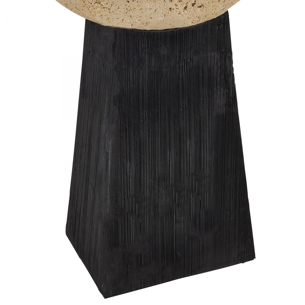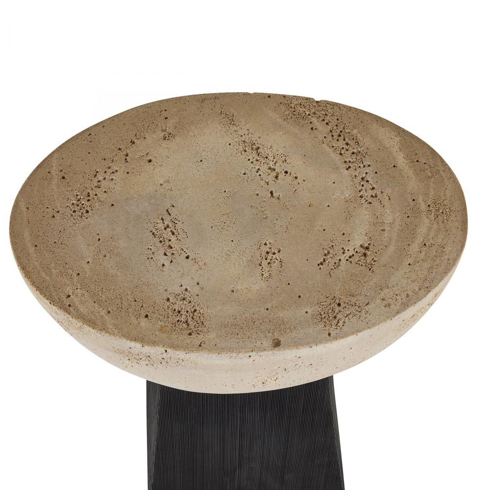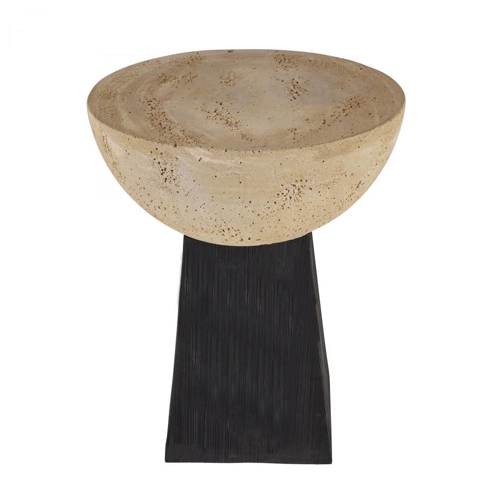 A geometric accent table is crafted of chai travertine concrete and black resin. The mixed textural finish of the concrete rounded top and geometric base adds a ceremonial quality to its intersecting form. Finish will vary.