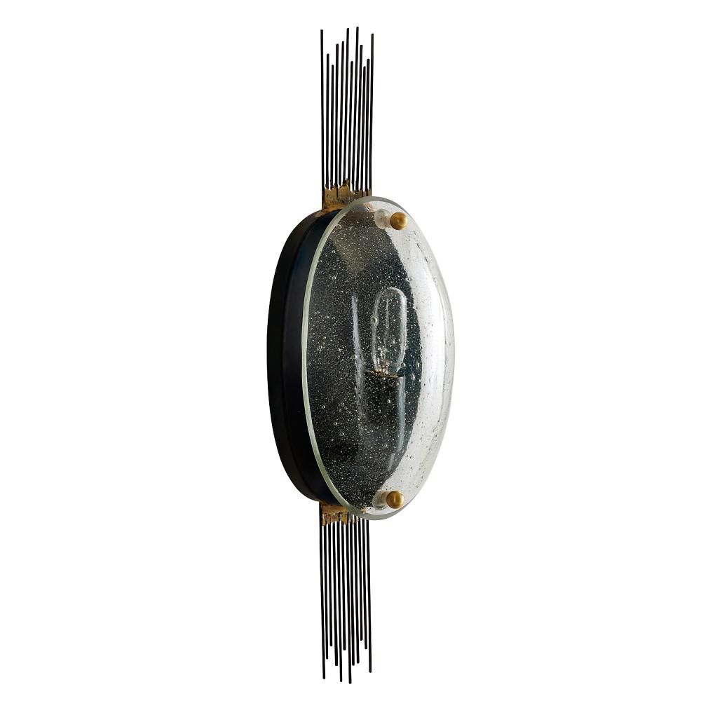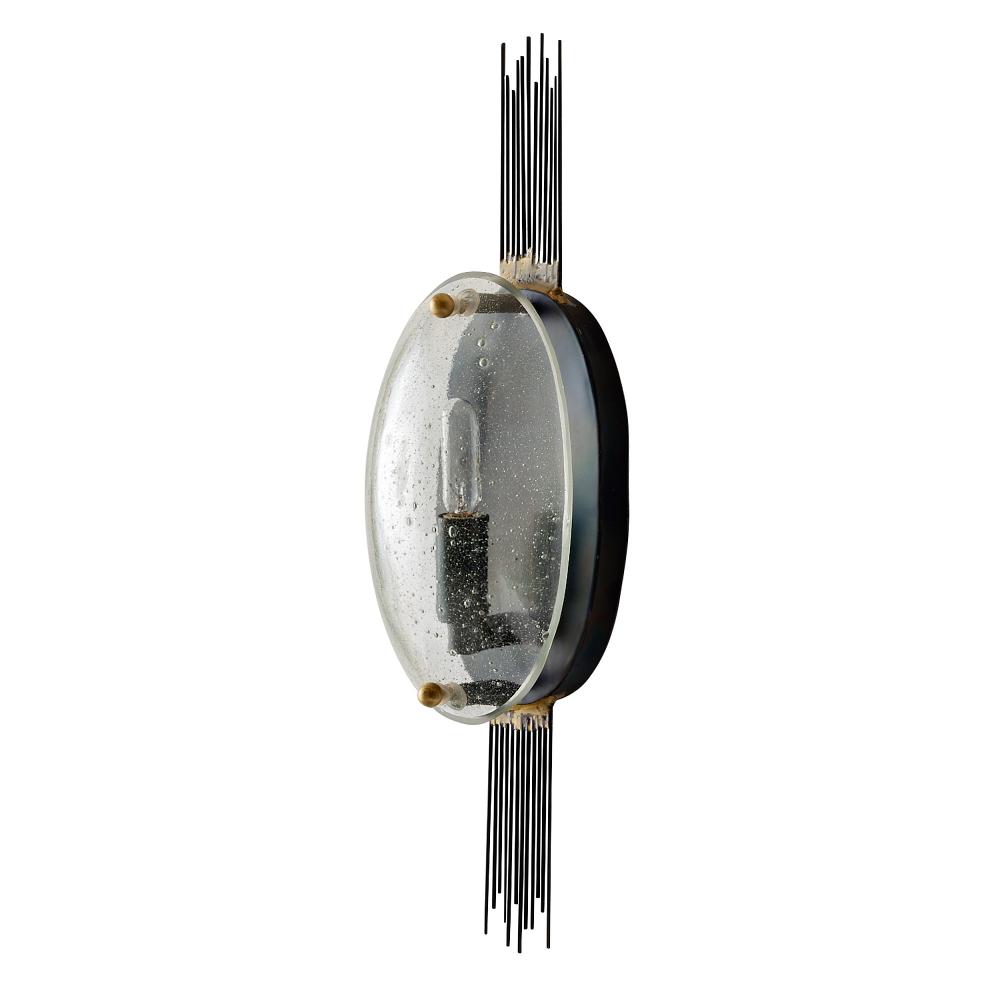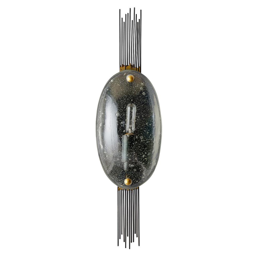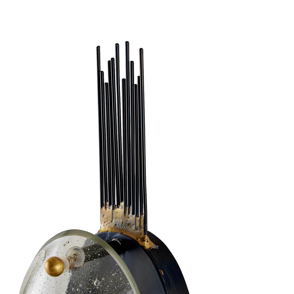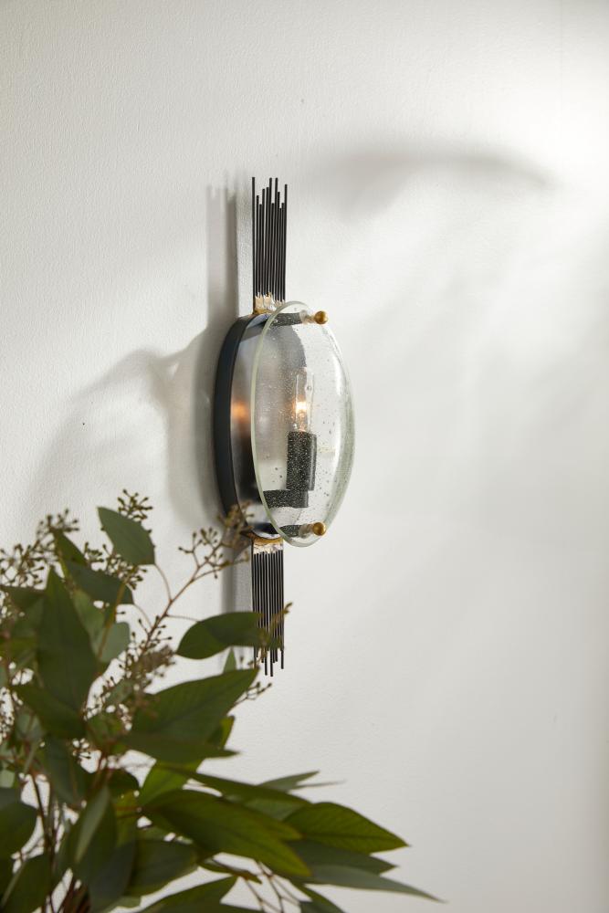 The shield-like Ernest casts an alluring mix of shadow and light wherever it is hung. Recalling a Brutalist brooch, a frame of natural iron, welded with antique-brass, seemingly “pierces” the fixture of clear seedy glass containing a single bulb. Antique brass rivet detail. Finish will vary.