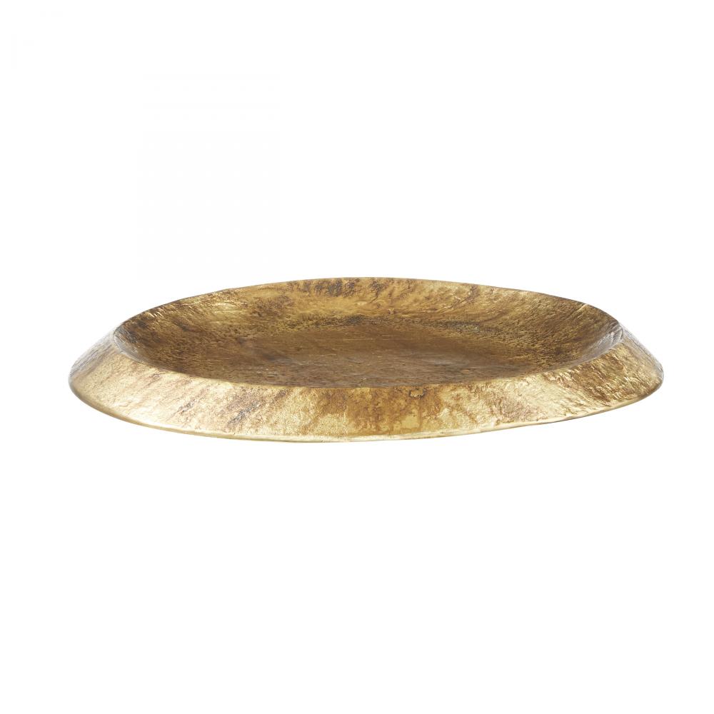 Simplistic in form, a shield of distressed antique brass is carefully aged to appear effortlessly burnished. We designed this cast aluminum centerpiece with a shallow dip and floating edges to make an over scaled home for your treasures. Finish will vary.