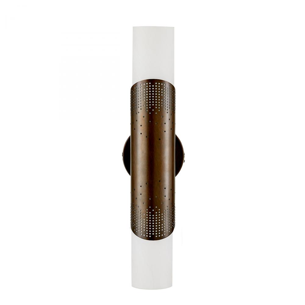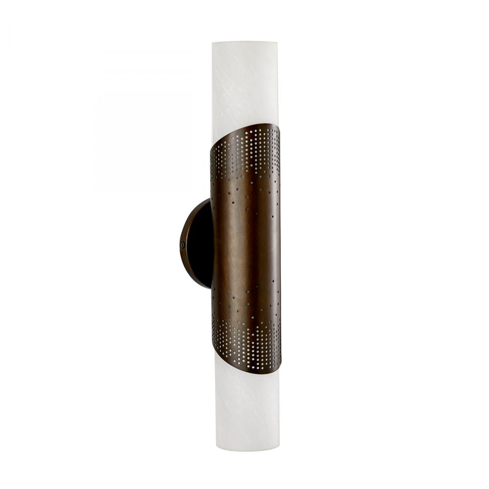 A softly rounded column of matte swirl glass is held by an English bronze-plated steel shield, perforated to let accents of light shine through. This linear style may also recall celestial constellations of the night sky.