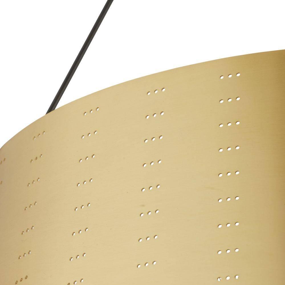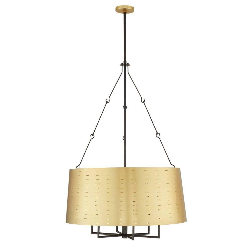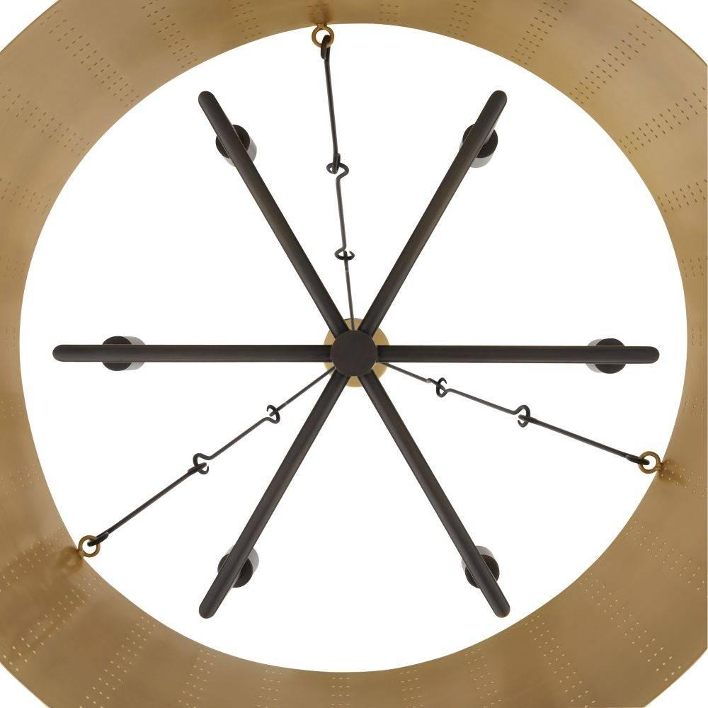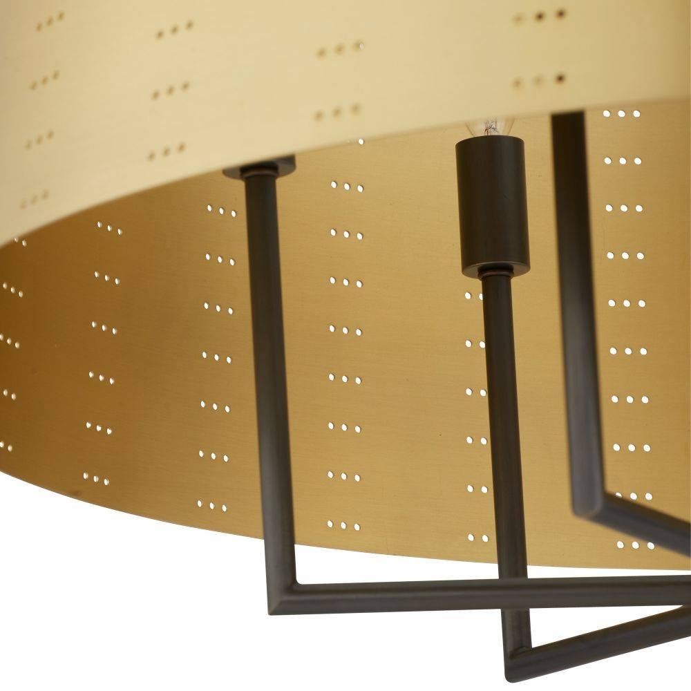 We perforated the Felipe to cast subtle shadows for a lace effect. Architecturally inspired, it juxtaposes an antique brass-plated iron shade with English bronze-plated iron arms and pipe. Damp-rated, although limited covered outdoor areas may affect finish.