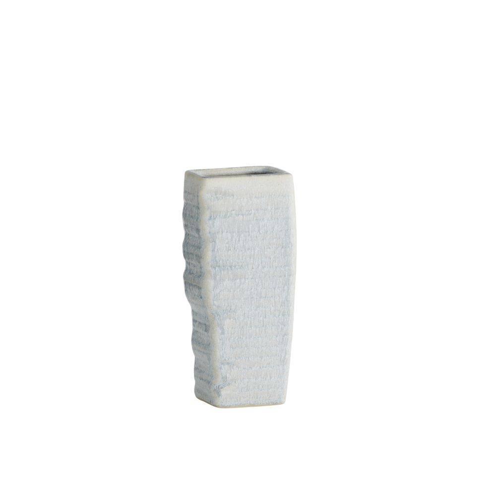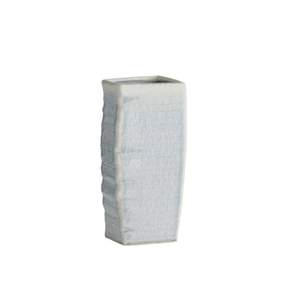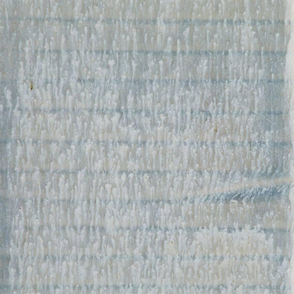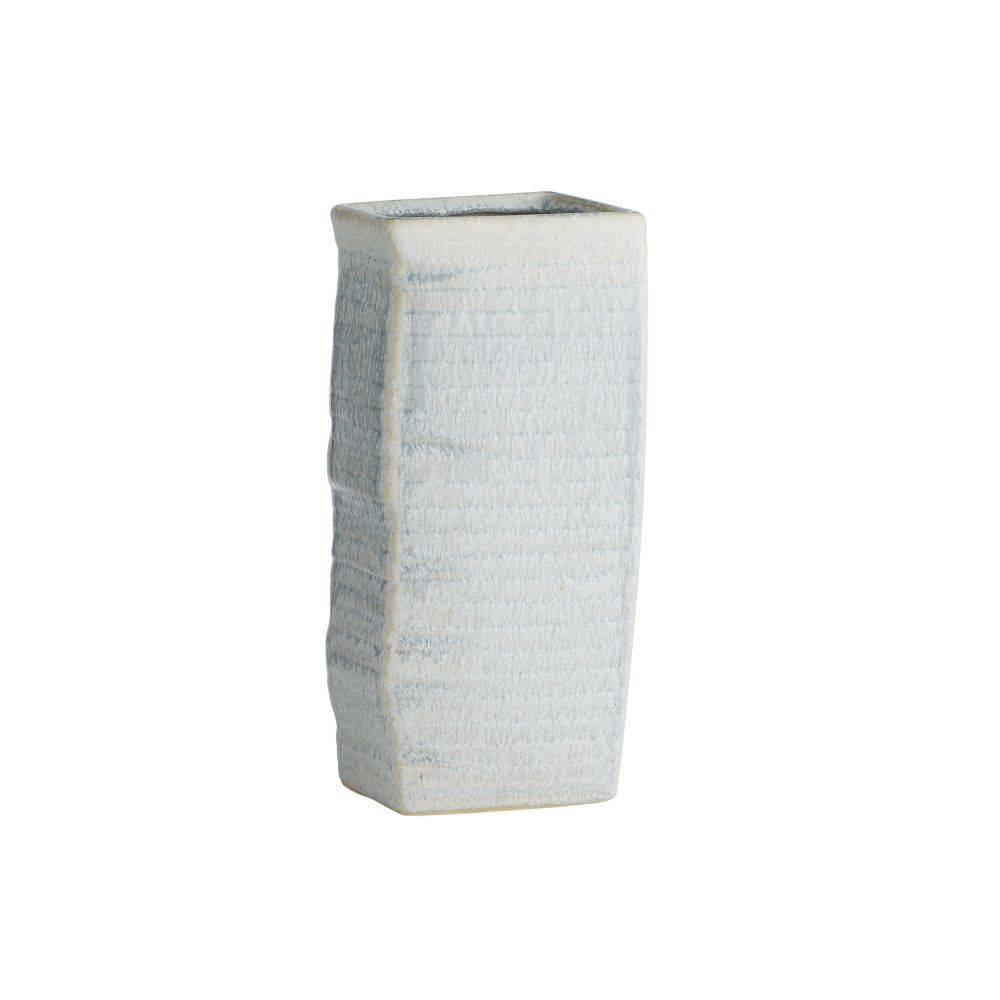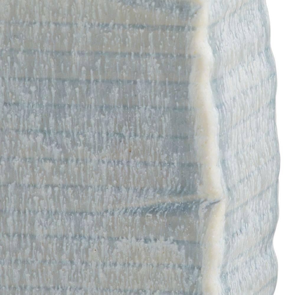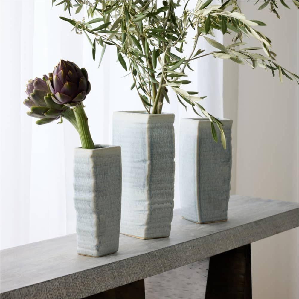 Abstract botanical elements lend a textural finish to a trio of ceramic vases. With a texture reminiscent of palm fronds, each is hand-cast, then glazed in an icy morn shade with subtle gradations of color. Finish will vary.