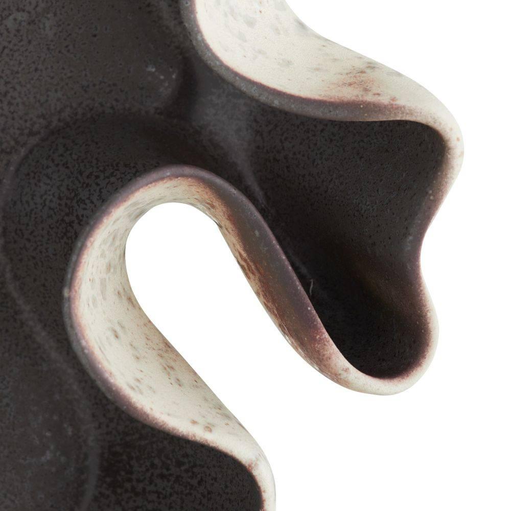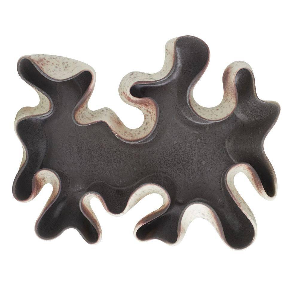 The free-form shapes of branching coral are echoed in a dramatic porcelain centerpiece. Glazed in our new sparrow reactive shade with a gunmetal reactive interior, the mix of hues results in a bleed of oxblood accents along each sinuous seam. Finish will vary.