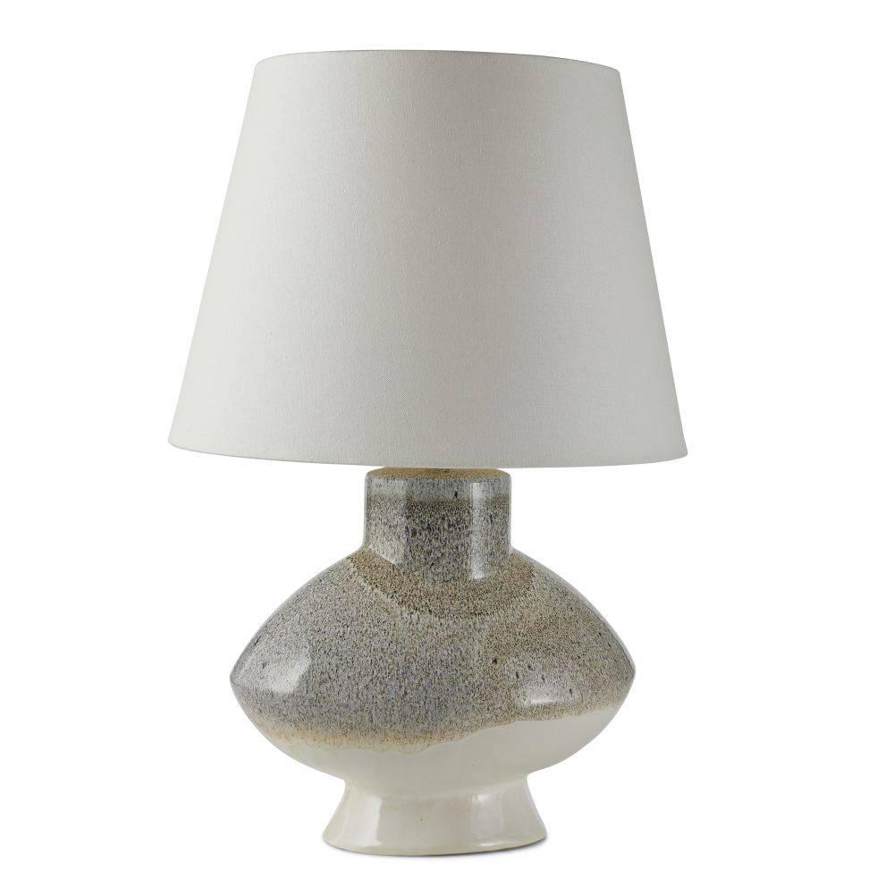 Glazed in an updated finish, the Ginn’s pebble reactive glaze results in a one-of-a-kind fixture. A brown irregular drip line highlights the irregular urn shape and is even more impactful when illuminated. This ceramic vessel is finished in an off-white linen drum shade and antique brass hardware with a matching ceramic finial. Clear silver cord. Finish will vary.