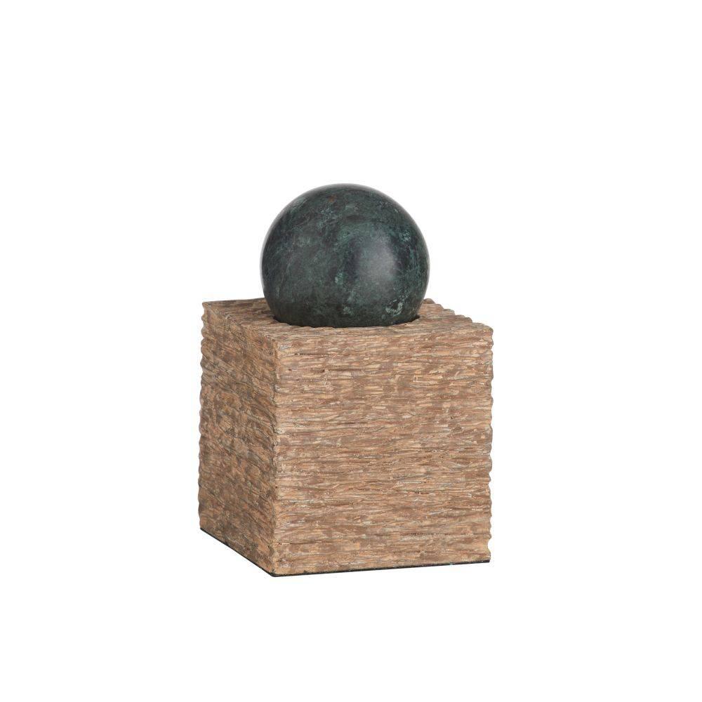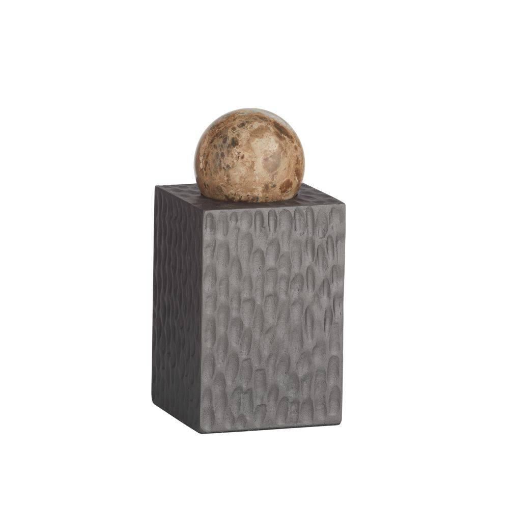 Monolithic resin pedestals of ash brown and graphite tones are the ideal base for this set of mixed-material forms. Textured with daubs and grooves, each sculpture is topped with a polished marble sphere in a contrasting forest or chamois shade. Can double as a stylish storage compartment for small items. Finish will vary.
