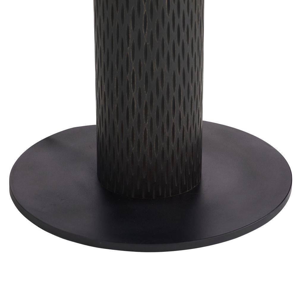 Intriguing angles and flower petal-inspired textures make this floor style eye-catching from any viewpoint. The Hartford's offset pillar base juxtaposes antique brass clad and carved black mango wood with a dynamic balance. A matching finial of mango wood complements the rounded base. Brass hardware and round off-white linen drum shade lined in off-white cotton.