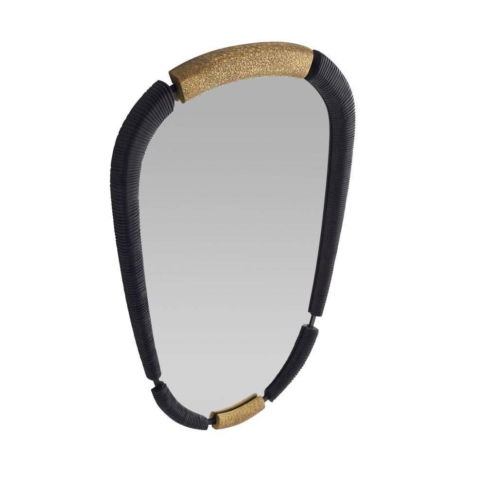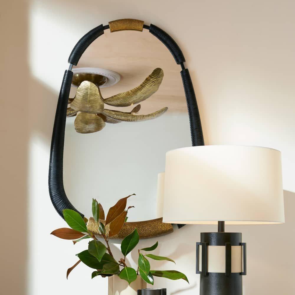 Reminiscent of ancient gold jewelry, our ebony-hued frame of carved mango wood is offset with accents of pebbled antique brass. The teardrop silhouette is enhanced with a carved ribbed texture, lending a dark, moody vibe to any space. Designed to be displayed vertically only, it is secured at the back with a cleat attachment. Finish will vary.