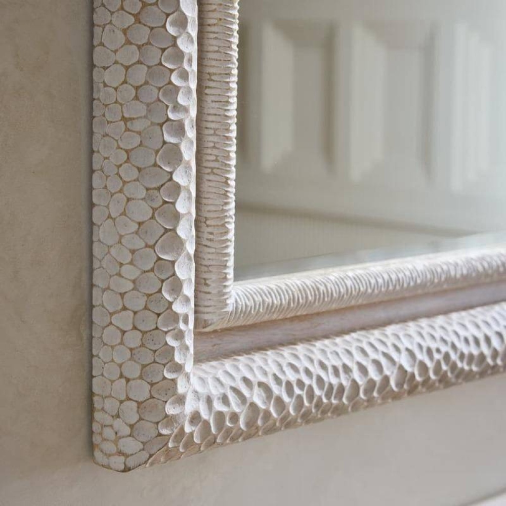 The organic pattern of a tree trunk guided our artisans' carving to create the textural mix of the Indo. Crafted of whitewash mango wood, this recessed frame offsets a beveled mirror. Designed to be displayed vertically only by a back cleat. Hanging hardware included. Finish will vary.