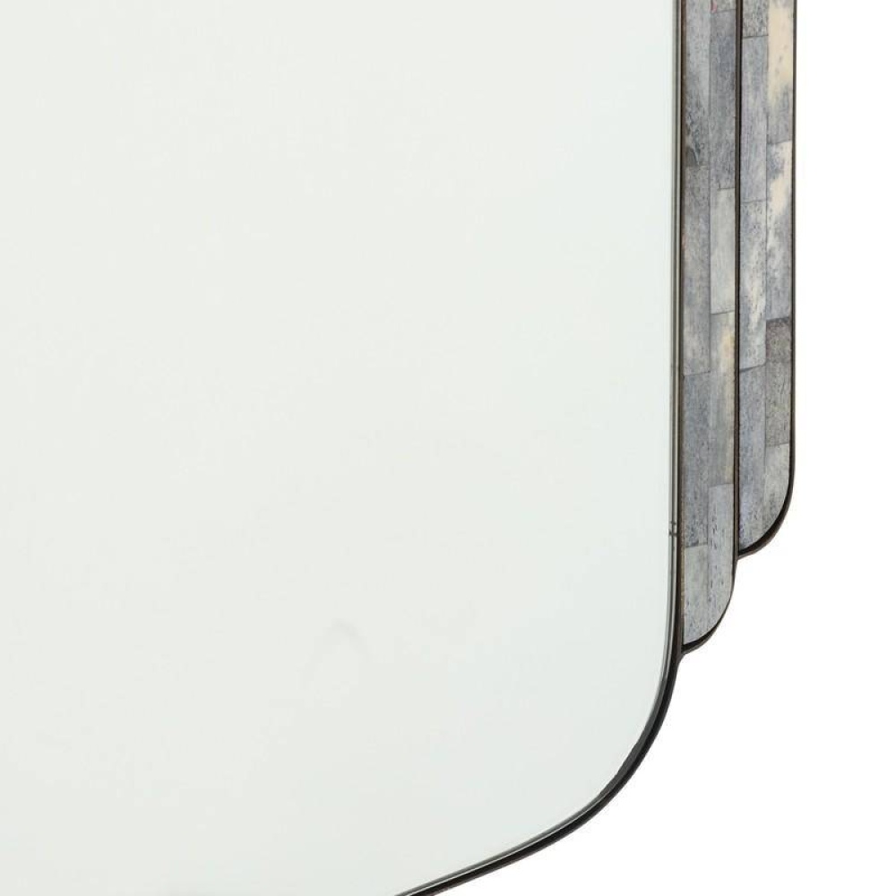 A modern twist on classic Art Deco styling. Tiles of inlaid gray bone give a naturalist accent to a streamlined frame of bronze iron. The layered shape is offset with a plain glass mirror. Designed to be displayed horizontally or vertically by a back cleat. Hanging hardware included. Finish will vary.