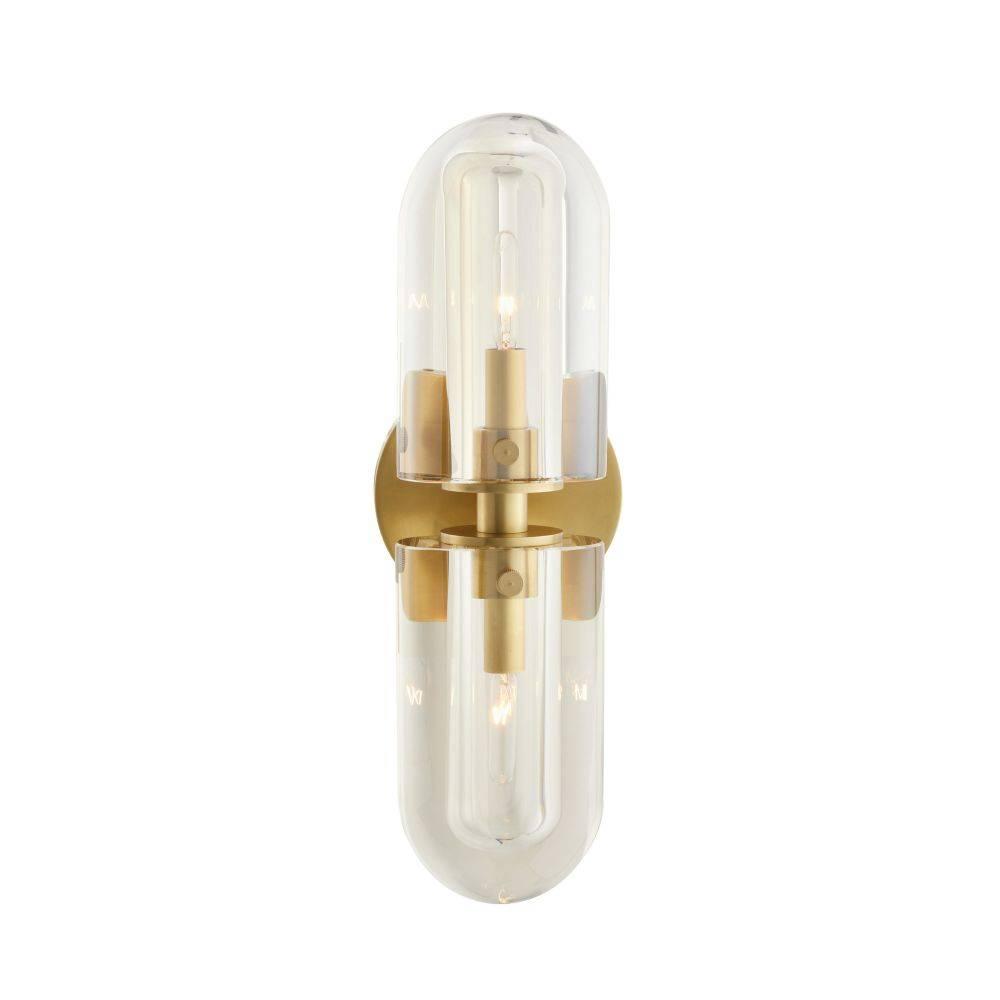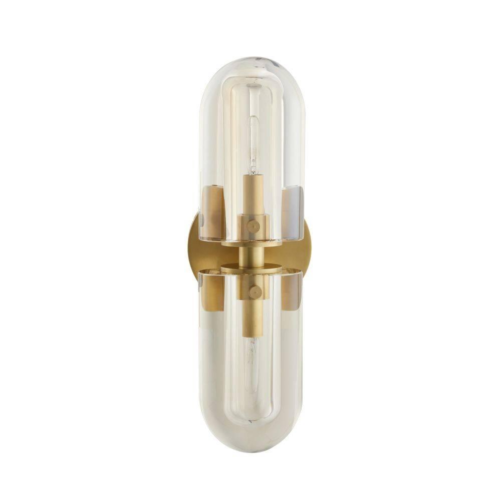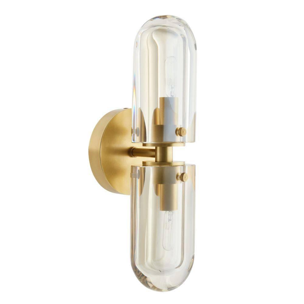 Modern and visually dynamic, this sconce is influenced by our Javier chandelier. An antique brass-plated hammered iron frame holds dual bullet-shaped champagne crystal shades. Each robust shade features a thick layer of reflective crystal surrounding two clear bulbs to add depth to the light. Damp-rated, although limited covered outdoor areas may affect finish.
