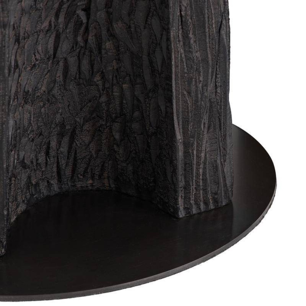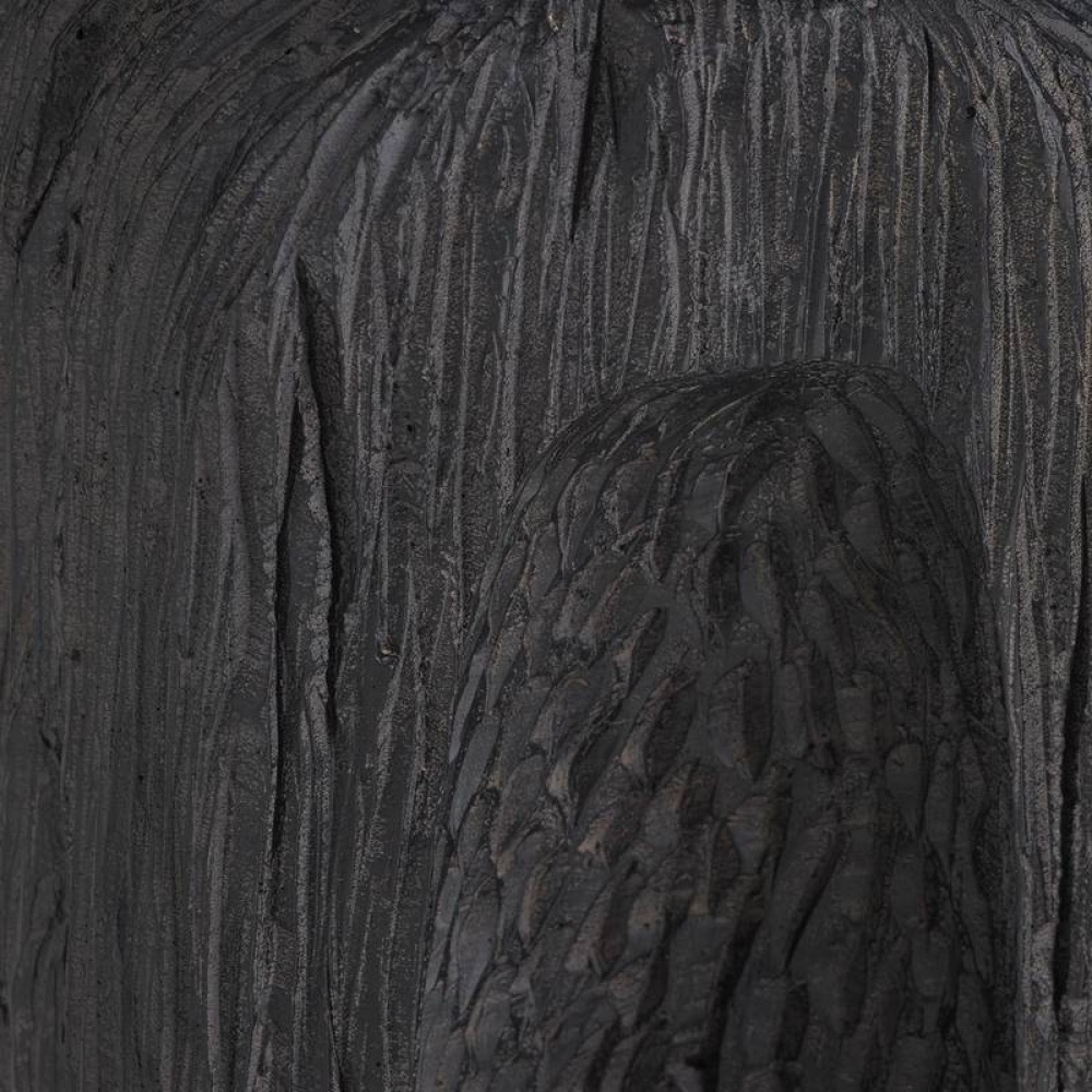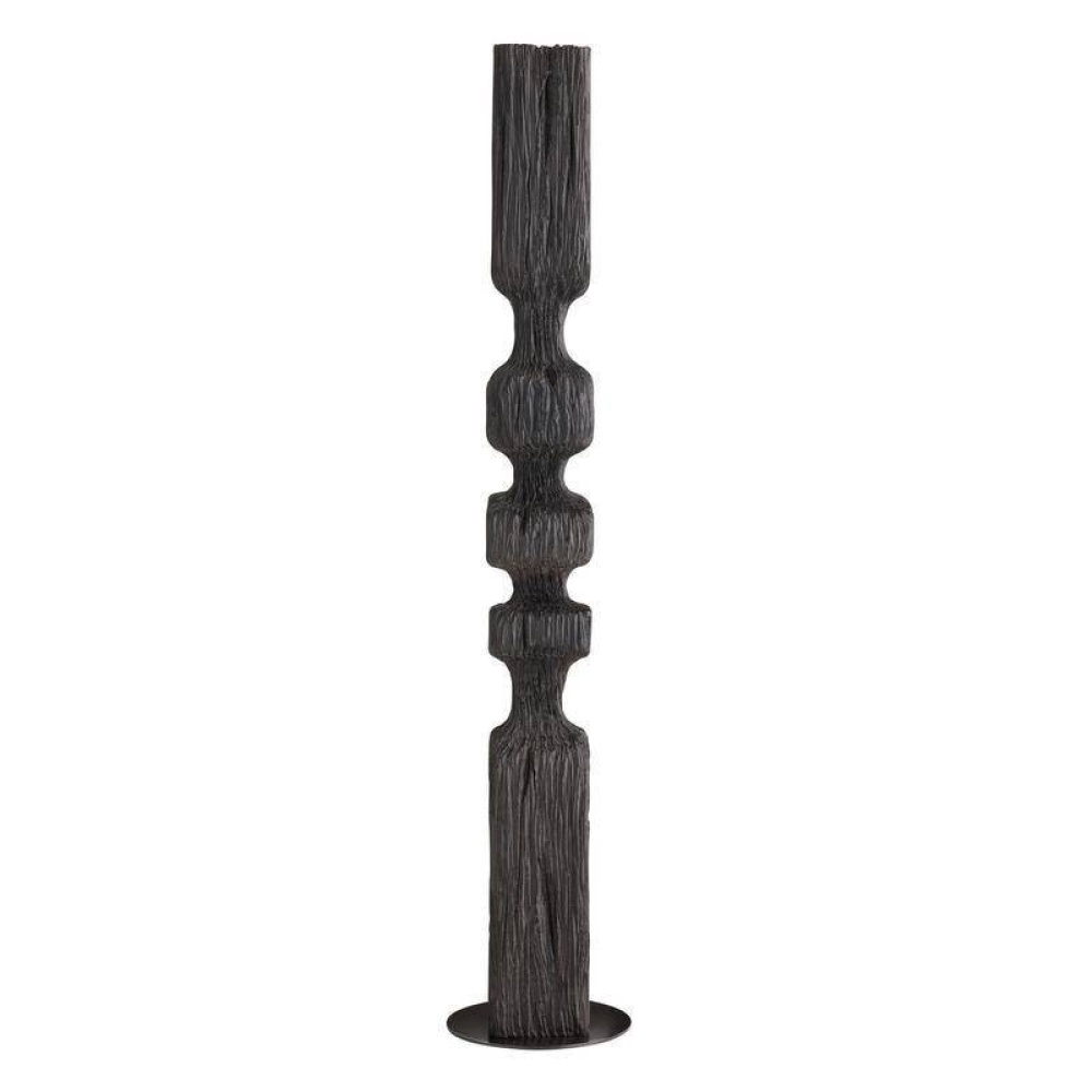 Designed to draw the eye, this monolithic sculpture of ebony resin makes a dynamic accent for any corner. The totemic-inspired shape resembles a fishbone, with a grooved texture that recalls sea-worn driftwood. Mounted on a circular bronze steel base.
