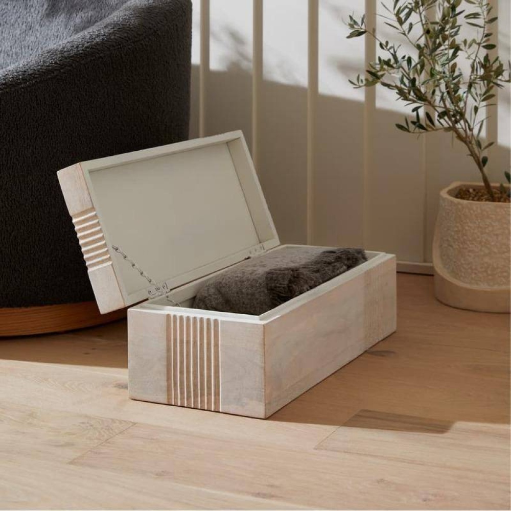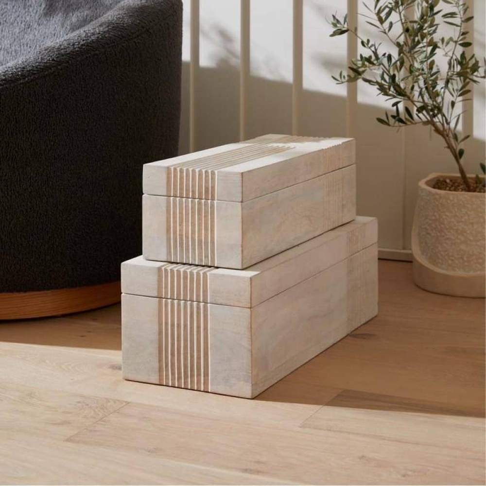 Dual oversized containers of whitewash mango wood make an elegant storage solution. Carved linework cascades in a flowing effect over the sides to draw the eye to this neutral accessory. Hinge and chain interior closure. Finish will vary.