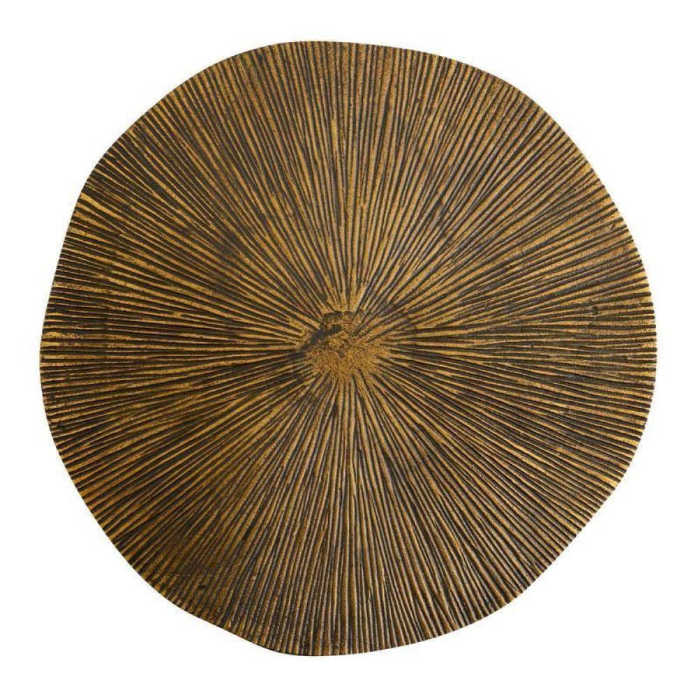 A circular top of antique brass cast aluminum is inspired by the natural grooves of a lily pad. Perched atop a notched bronze cast aluminum base, this style is a naturally wonderful accent for any seating area. Finish will vary.