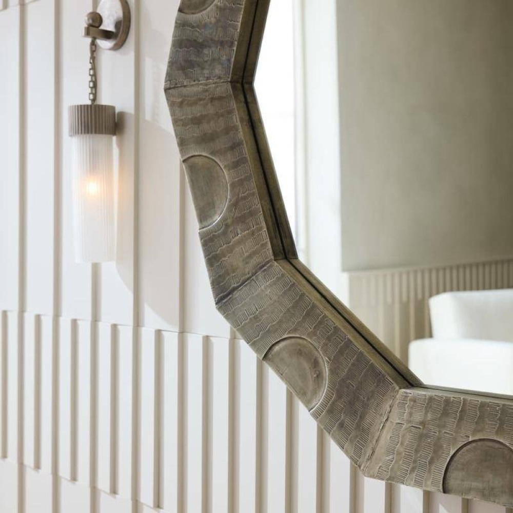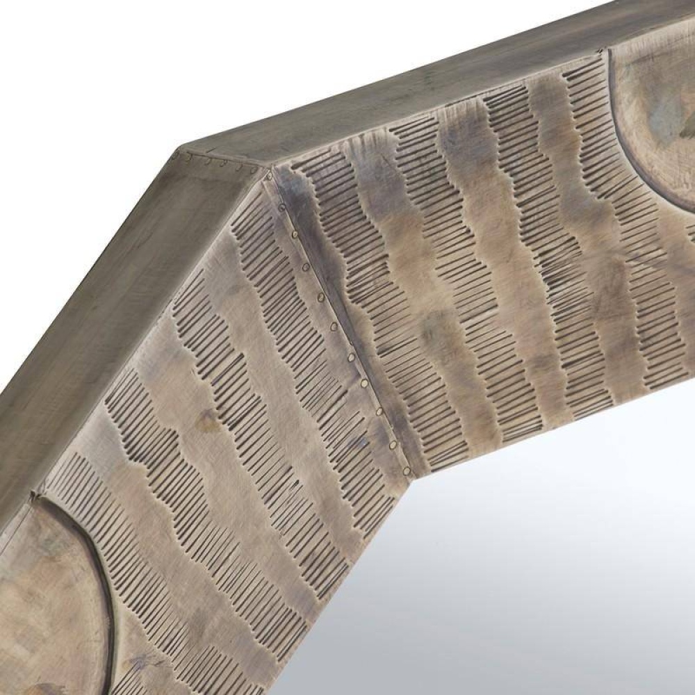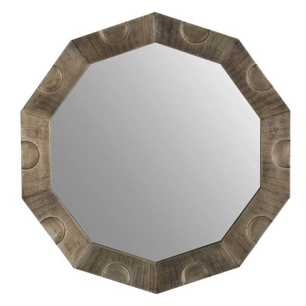 An oversized decagon frame of burnished silver brass clad was designed to deliver maximum drama to any wall. Inspired by architectural molding, intricately scalloped details are added for texture. Designed to be displayed horizontally or vertically by a back cleat. Hanging hardware included. Finish will vary.