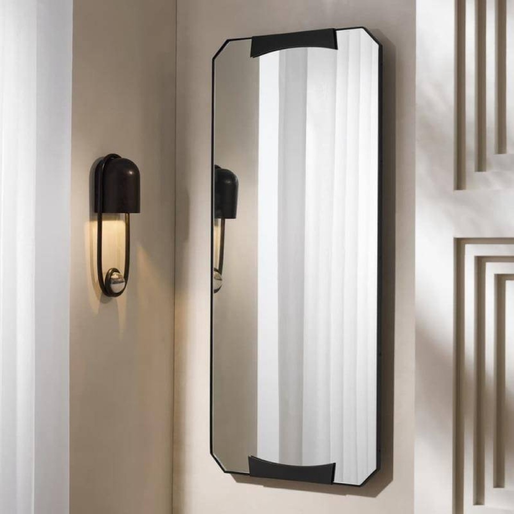 Elegantly modern, the Kris Rectangular Mirror displays a refined geometric design. Gracefully formed brass clasps hold this mirror top and bottom, all in a bronze finish over a blackened iron frame. The raised design creates depth and adds chic sophistication. Security cleat hanging hardware included and allows for vertical or horizontal display.