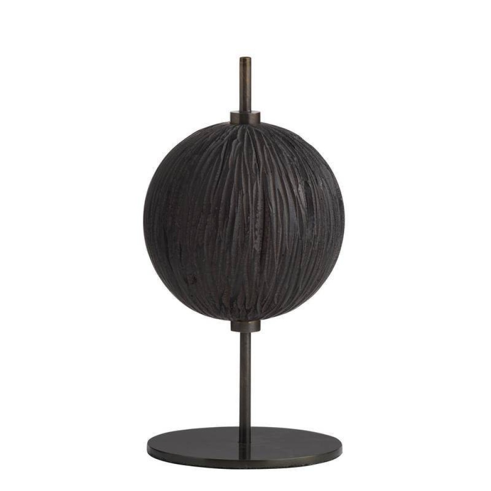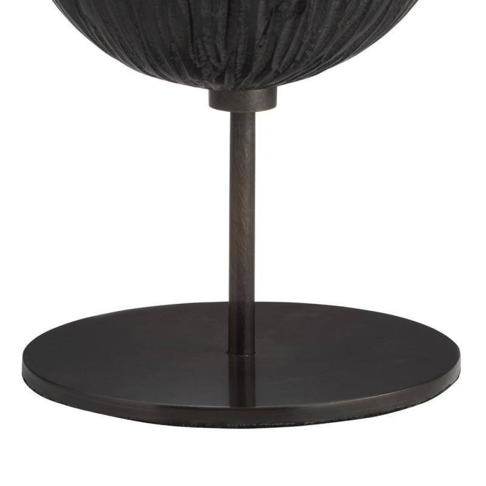 This set of organic forms is inspired by Japanese shou sugi ban is reinterpreted in ebony resin. Each rounded sculpture is reminiscent of a seed pod, pierced with an accent English bronze steel. Two of the trio are mounted securely on a base.