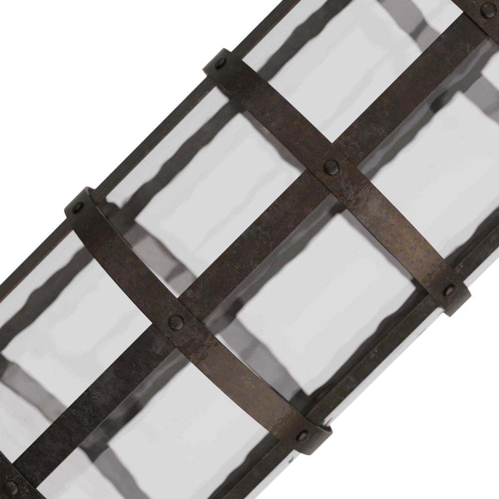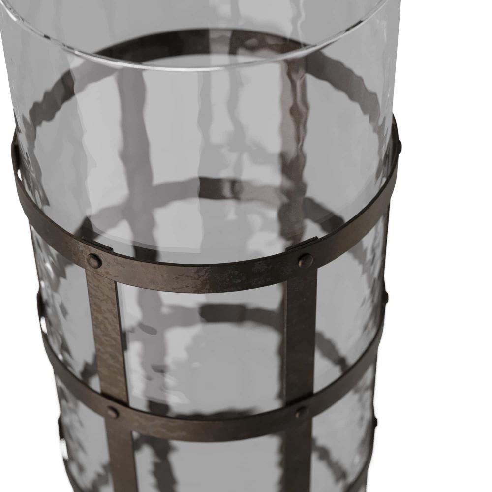 AS A BLACKENED IRON BASKET FITTED WITH A CLEAR HAMMERED GLASS CYLINDER, THIS AMPLE VASE IS PERFECT FOR LARGER LIMBS AND BRANCHES, OR FILL IT WITH ORANGES, LEMONS, OR GREEN APPLES AS A COLORFUL SCULPTURE.