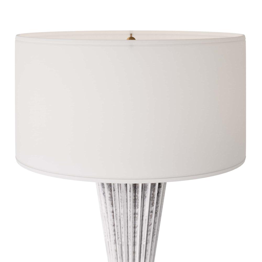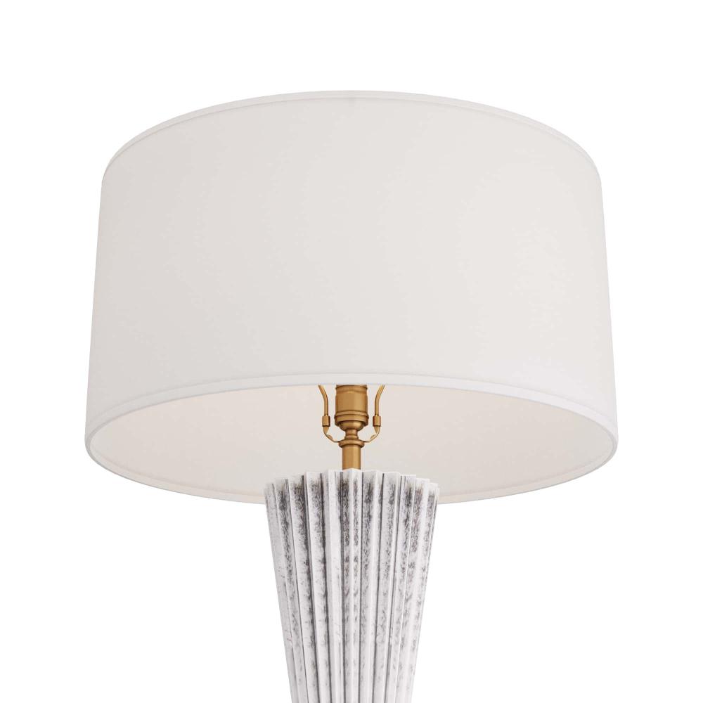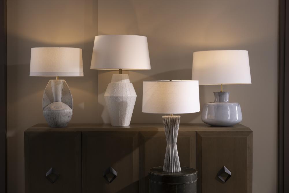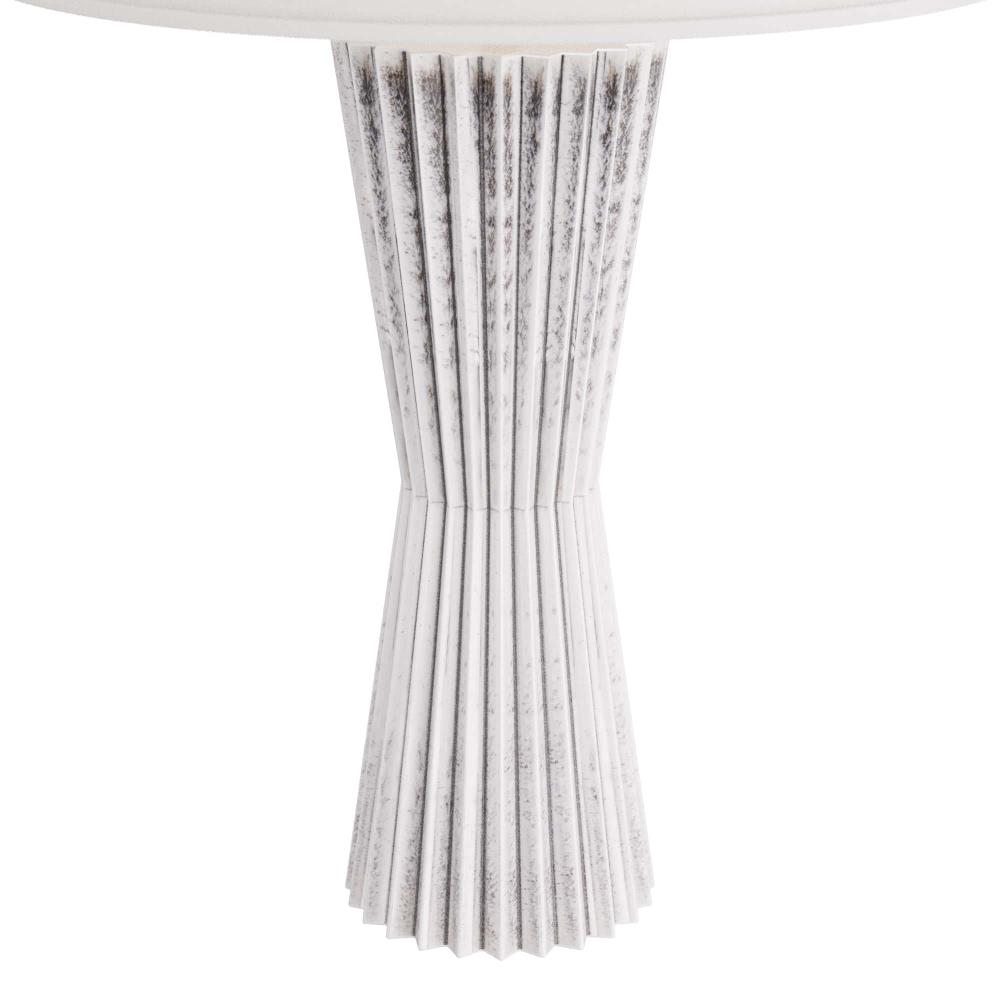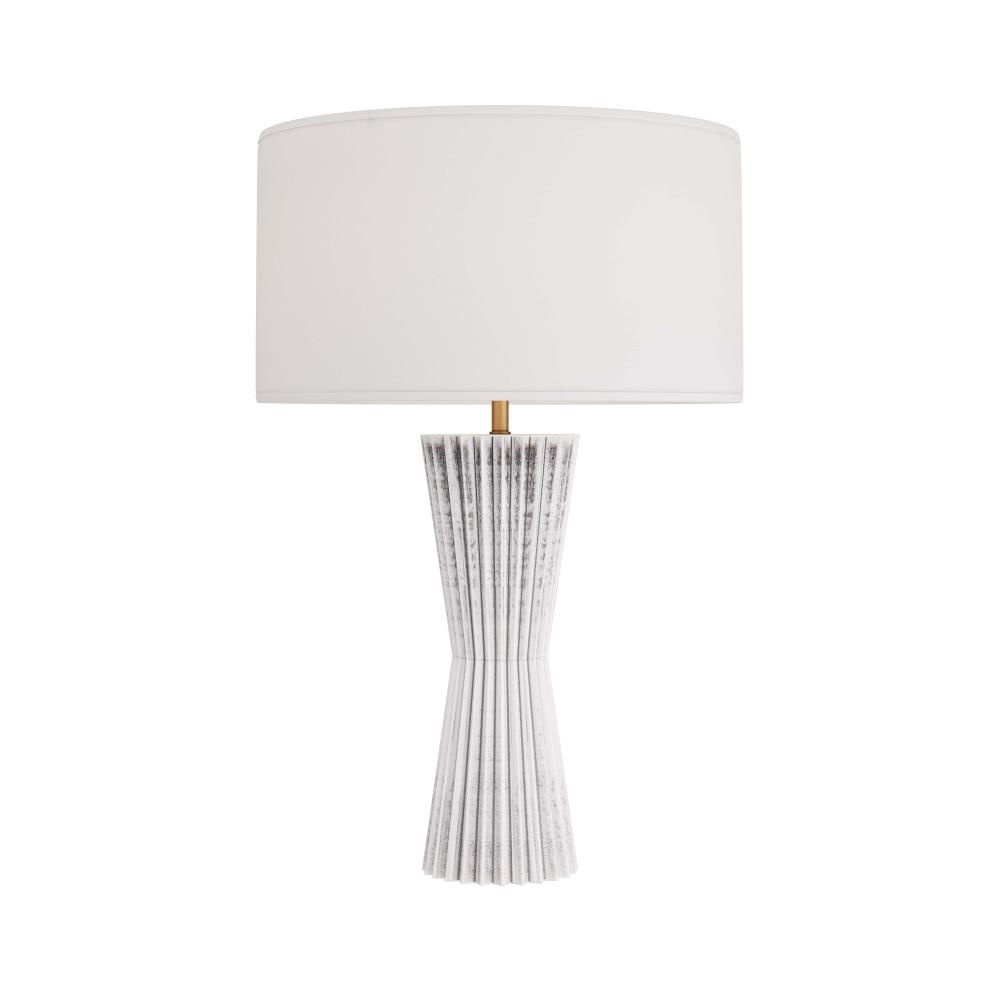 THE ELEGANT VAYLA TABLE LAMP IS FASHIONED IN A LITHE, HOURGLASS SILHOUETTE WITH A CINCHED WAIST. CRAFTED IN ICE REACTIVE CERAMIC, THE PIGMENT SETTLES INTO THE LAMP’S ZIG-ZAGGING RECESSES TO CREATE DIMENSION, AS LIGHT BOUNCES OFF THE LIGHTER RIDGES. THE PIECE IS TOPPED WITH A WHITE LINEN DRUM SHADE, LINED IN WHITE COTTON. FINISH WILL VARY.