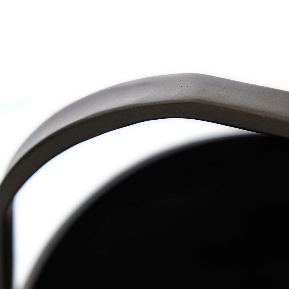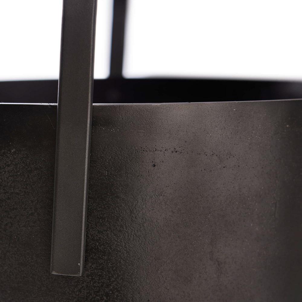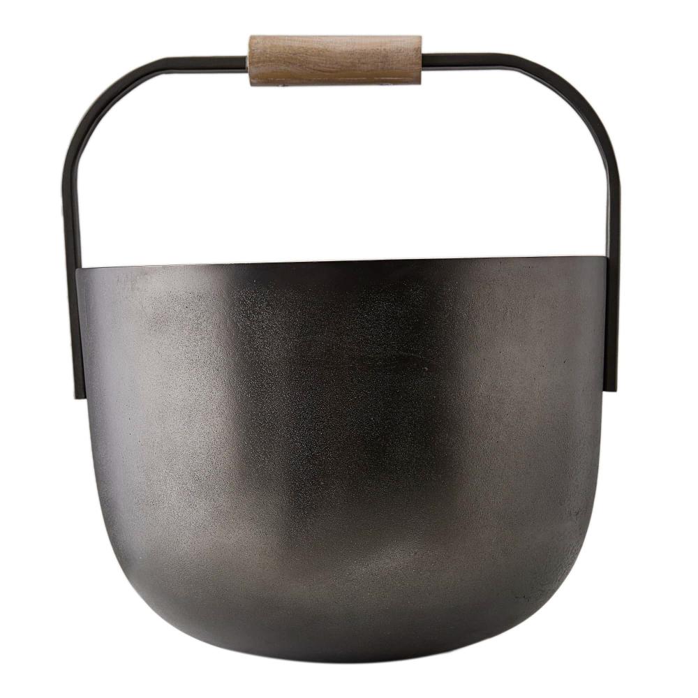 A FIREPLACE ACCESSORY WITH SERIOUS PRESENCE, THE VERMEER FIREWOOD BASKET IS FORMED FROM BLACKENED CAST ALUMINUM AND FEATURES A WOOD HANDLE OF MANGO WOOD FINISHED IN SMOKE. THE OVERSIZED VESSEL OFFERS A STYLISH WAY TO BUNDLE LOGS, KINDLING OR OTHER HOME FURNISHINGS. FINISH WILL VARY.