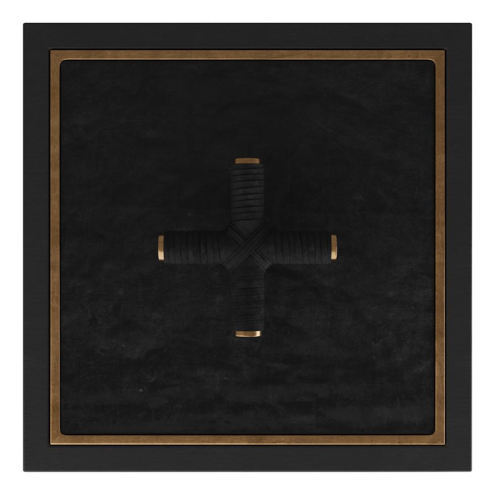A stylish storage element for any room. The Xander is made of ebony stained wood with an inset bezel of antique brass. Topped with a beautiful black leather-wrapped brass criss-cross handle for easy opening. Finish will vary.