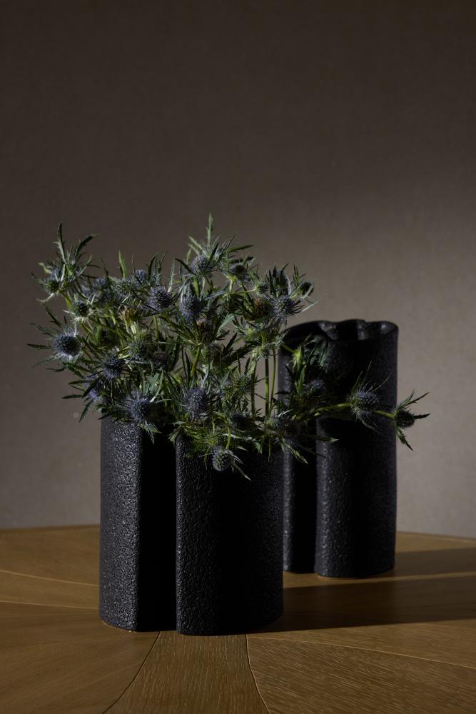 The flowing forms and gentle curves of these extruded vases offer the best of the natural and material worlds. Crafted of black ceramic, the textural finish recalls volcanic rock. Set of two. Finish will vary.