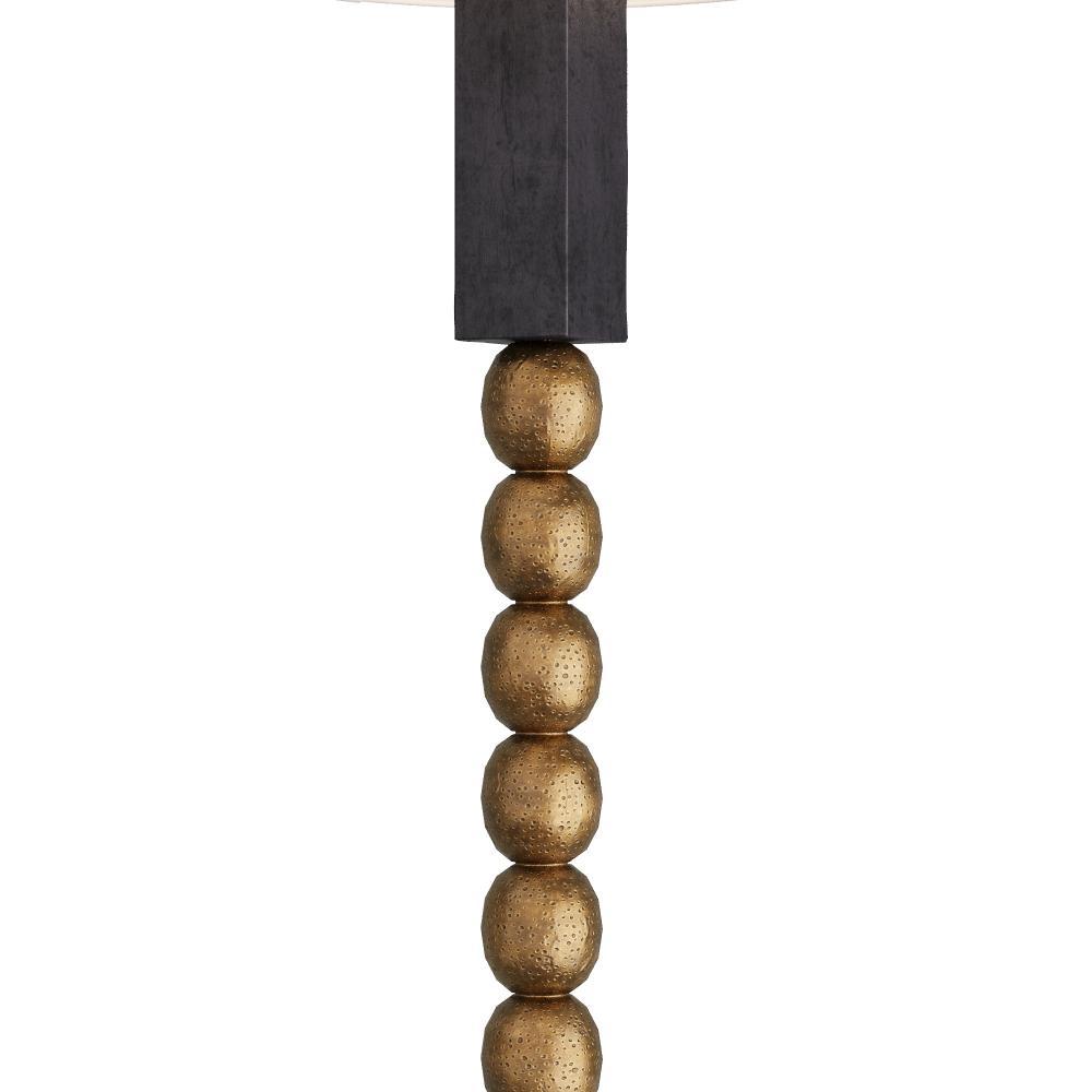 Texture on texture elevates the modern Yonah. Blocks of ebonized mango wood border a totem of antique brass spheres. Bringing the best of the natural and modern worlds together, its sculptural form is finished with a drum shade of white linen. Clear silver cord and three-way rotary switch.