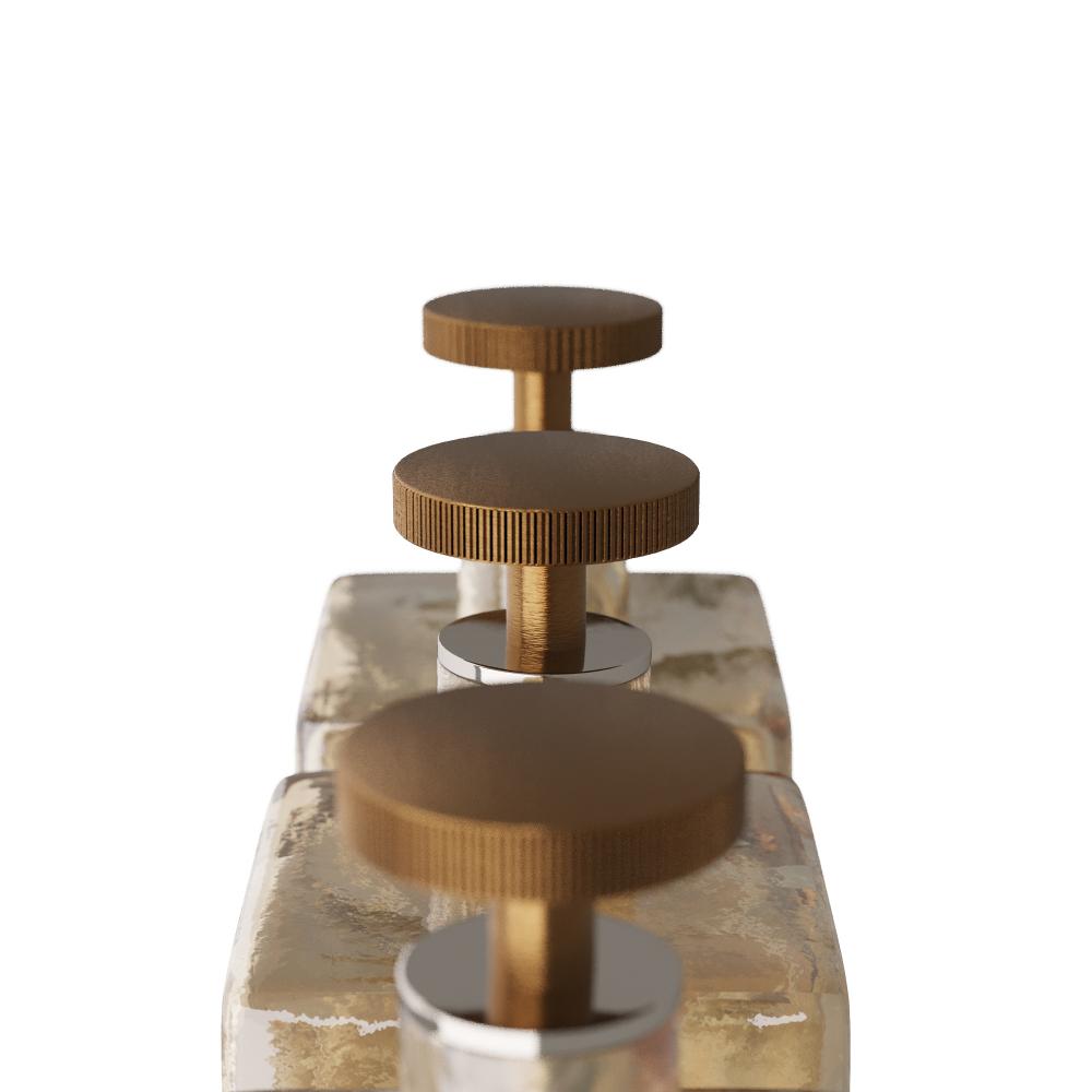 Decanters of smoke luster glass make an industrial-inspired statement. Designed with free form indentions for a handmade feel, each cast sculptural design is topped with a ribbed stopper of vintage brass. Set of three. Finish will vary.