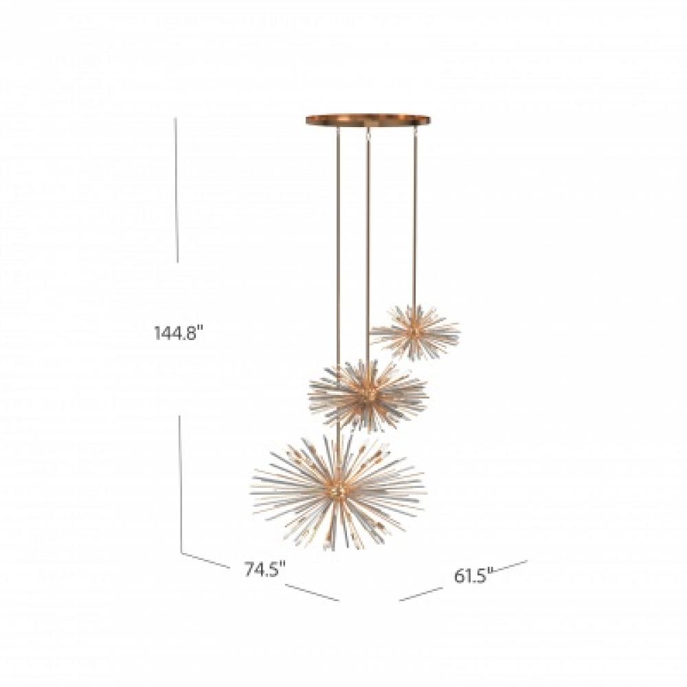 Inspired by the iconic Sputnik design, the Palisades Ave. Collection showcases a dynamic arrangement of varying-sized spokes radiating from a central spear base. This striking fixture is beautifully accented with a mix of glass, metal rods, and glowing bulbs, creating a captivating play of light and form that adds bold sophistication to any space.