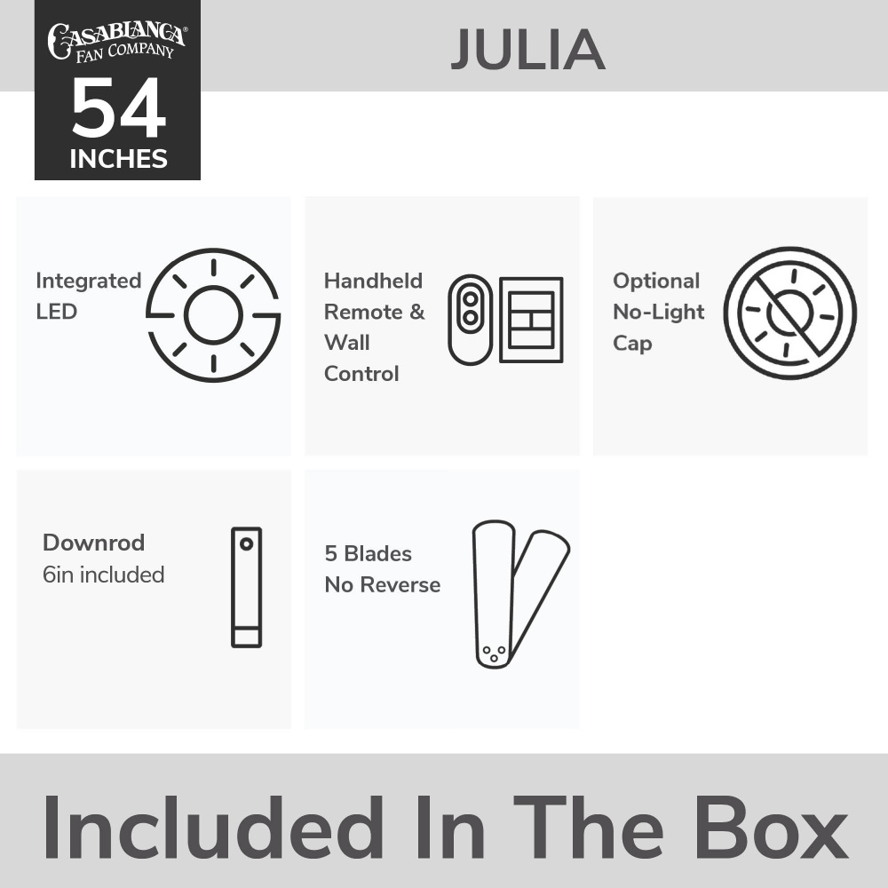 Join us in celebrating the Julia Outdoor Ceiling Fan, where expert craftsmanship meets lasting quality. Built with our SureSpeed® Guarantee for unmatched airflow and powered by a quiet yet powerful 6-speed Eco Whisper DC motor, it delivers comfort with style. ENERGY STAR® certified, it’s up to 64% more energy-efficient. Damp-rated for covered outdoor spaces, the Julia features an LED module, metal accents, and a relaxed design perfect for patios, living rooms, or bedrooms. A No Light Cap is also included for a clean, minimalist look when lighting isn’t needed. Celebrate Casablanca’s 50th anniversary with this innovative, timeless addition to your home.