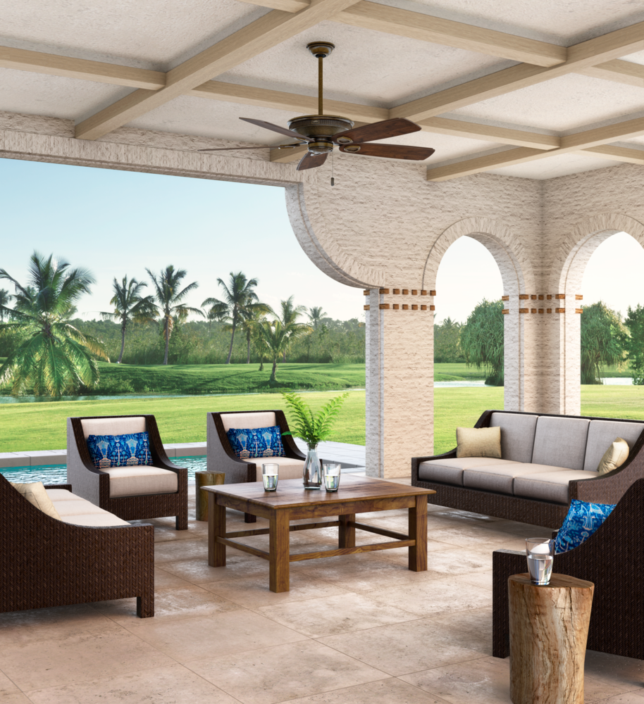 During the Industrial Revolution, innovations in manufacturing enabled artisans to create furniture from cast iron. The Heritage fan incorporates many of the design details featured in antique castings, including vertical ribbing on its motor housing, raised type on the switch cap, and a custom cobblestone texture on the fan body, cap and inset portions of the blade medallions. Designed with stainless steel hardware to withstand the elements, this wet-rated ceiling fan is an ideal addition to any areas exposed directly to weather like your large patio or pergola.