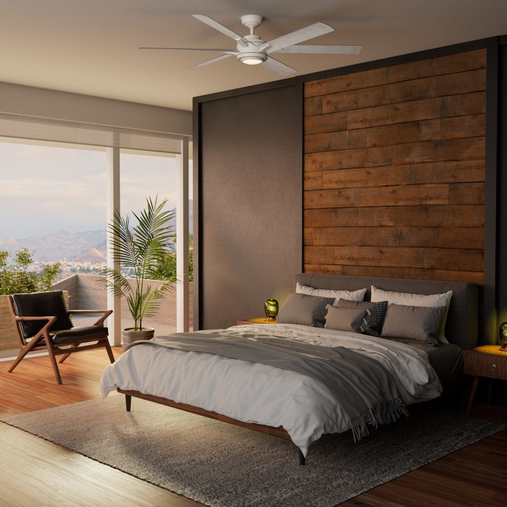EFFORTLESS CONTROL & DIMMING: Integrated LED lighting with painted cased white glass, paired with a wall control and handheld remote for easy adjustments to fan speed and brightness.