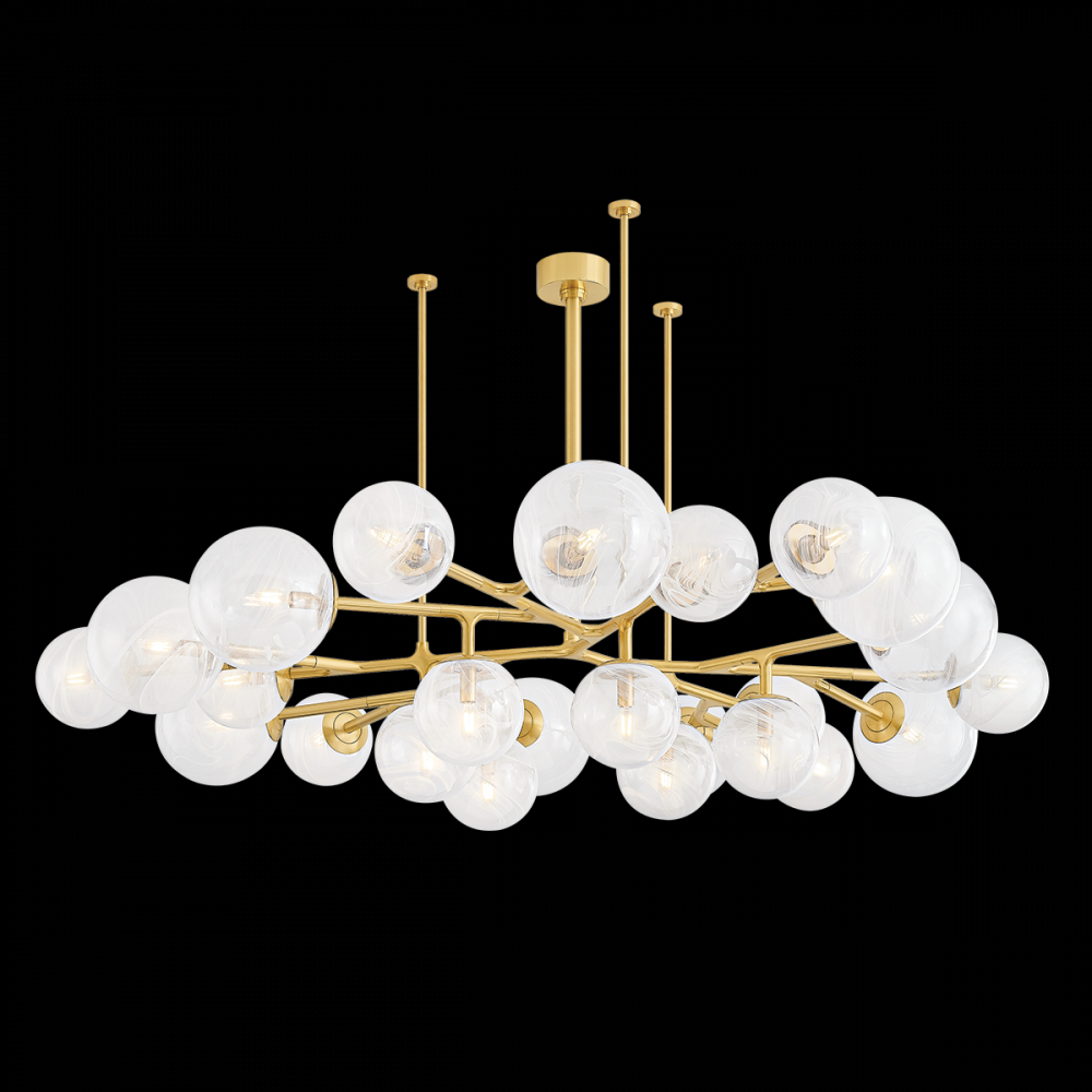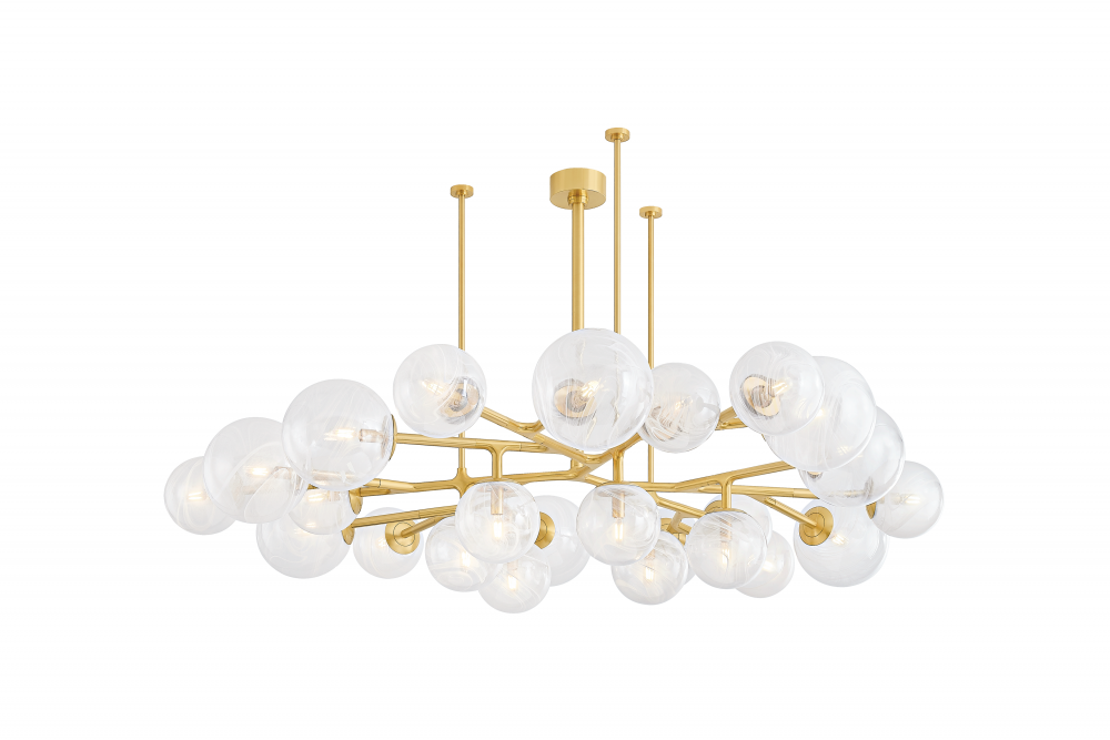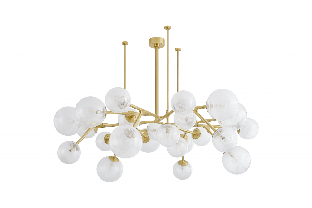 The Glasgow family of chandeliers and linears captures the old-meets-new vibrancy of its namesake Scottish city. Resembling celestial bodies in the night sky, the Remolino Blanco swirled glass globes are suspended from a branch-inspired Vintage Polished Brass frame. Choose from different formats to suit your space, from 8 to 24 lights.