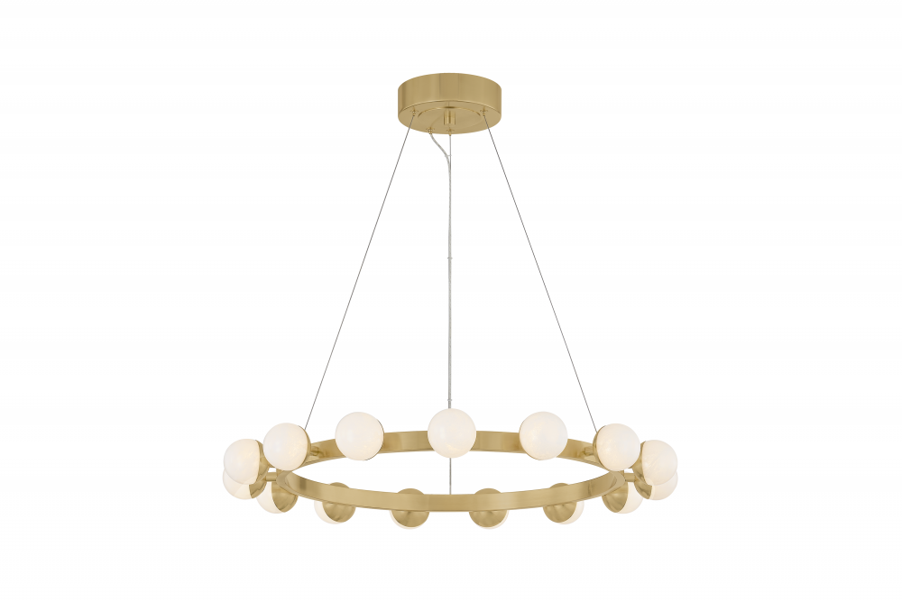 Elements of repetition and scale are skillfully balanced in the Linus chandelier to create a striking visual impact. Finished in Vintage Brass, the concentric rings that form the framework support a series of globes. Marked by a unique, crackled effect, the antique quality of the White Luna glass adds an air of artistry. What sets this family apart is its versatility: despite the five distinct options, only three rings are used to create an array of configurations.