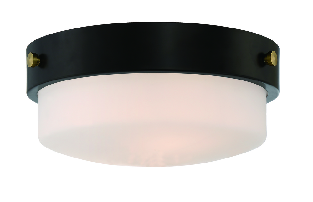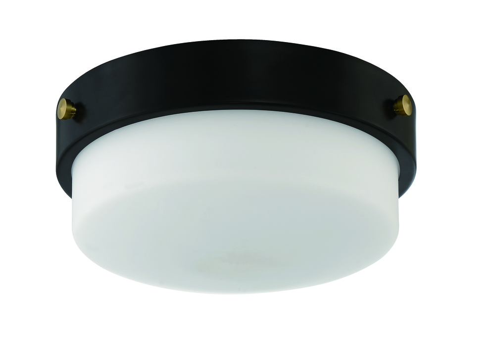The Oak Street Collection , inspired by strength of classic turn of the century lighting, features a striking combination of sleek metal and white frosted glass in your choice of brushed polished nickel or flat black. The flat black finish includes brushed polished nickel, flat black and satin brass knobs to customize your look. The Oak Street Two Light Flushmount Collection is available in 11" and 13" diameter and each uses two 60W medium base bulbs.