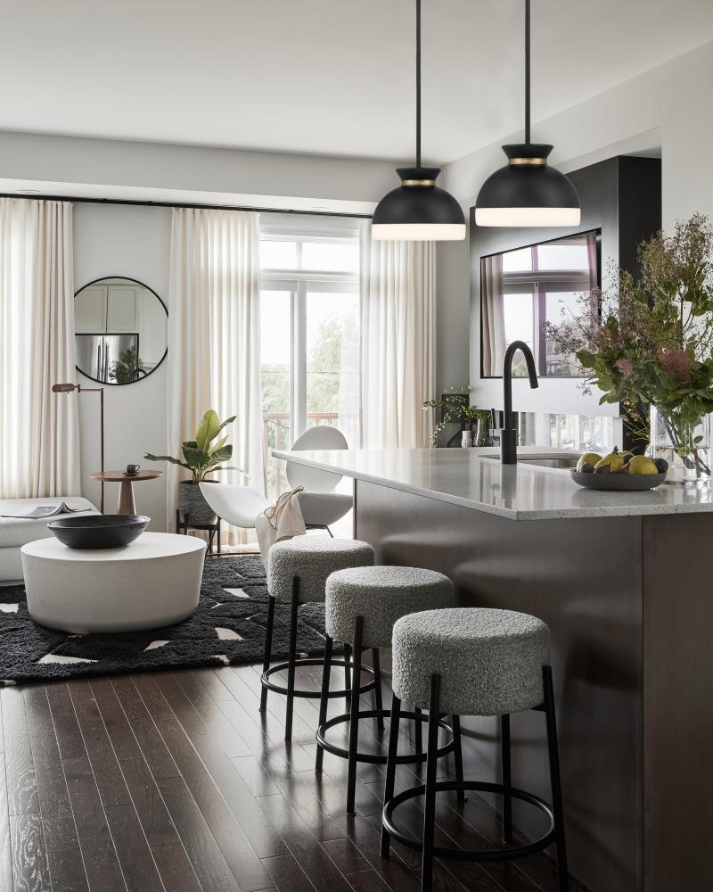 The Gidgit collection designed by Brian Patrick Flynn, features a versatile two-toned design with options in gold or black, paired with sleek white glass. This mid-century-inspired dome-shaped design comes in multiple sizes and offers timeless appeal and adaptability. Its clean, rounded silhouette makes it an ideal choice for various spaces, from kitchens to dining areas, seamlessly blending into modern and classic interiors.