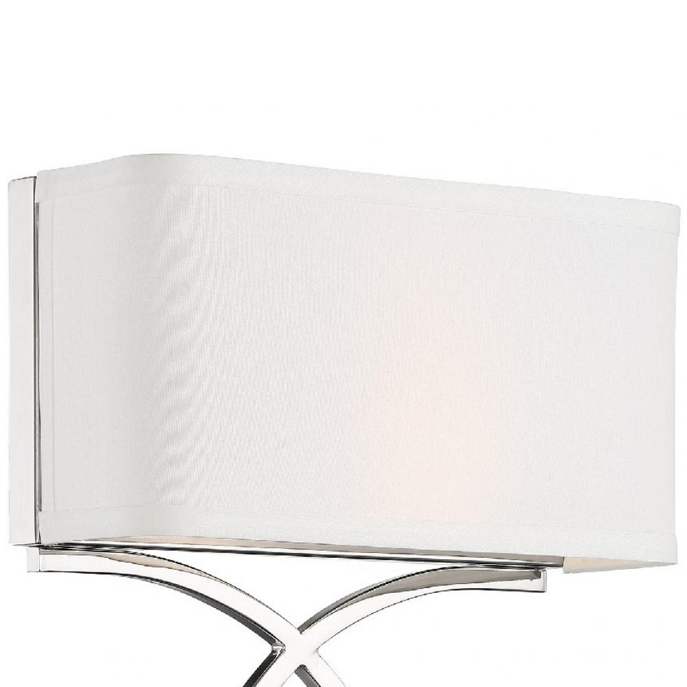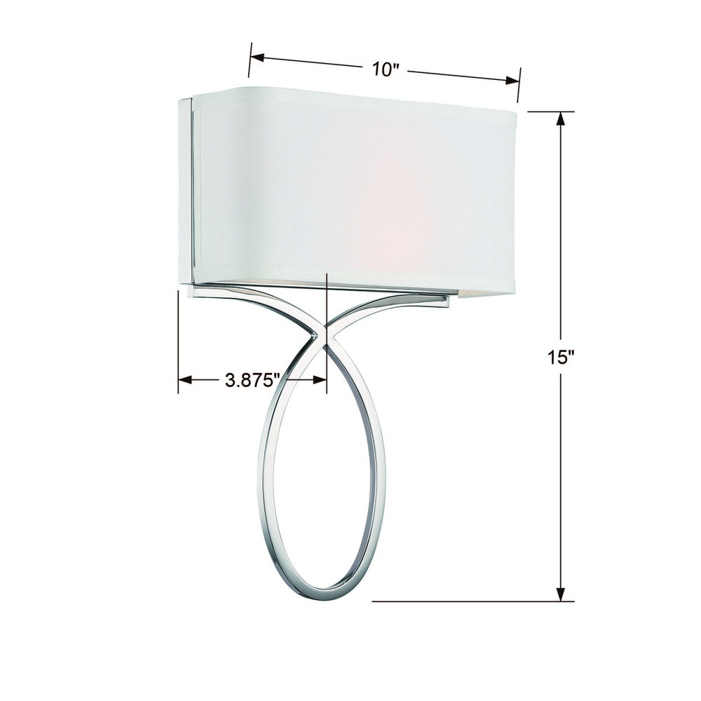 The minimalist two-light wall sconce features an oval metal accent below the white silk rectangular shade. Its simple form can be used for a contemporary or transitional home while versatile enough to be incorporated into any design.