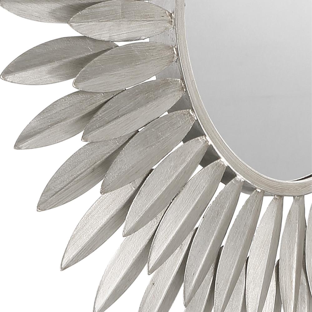 Inspired by Crystorama’s iconic Broche Collection, this stunning mirror brings sculptural artistry to wall décor. The mirror features a radiant sunburst design with hand-forged metal leaves arranged to evoke elegance and organic beauty. The intricate leaf-shaped detailing channels a refined sense of nature-inspired aesthetics, adding warmth and charm to any interior. This mirror is ideal as a focal point in entryways, living rooms, or bedrooms, and it pairs beautifully with contemporary and classic design styles.