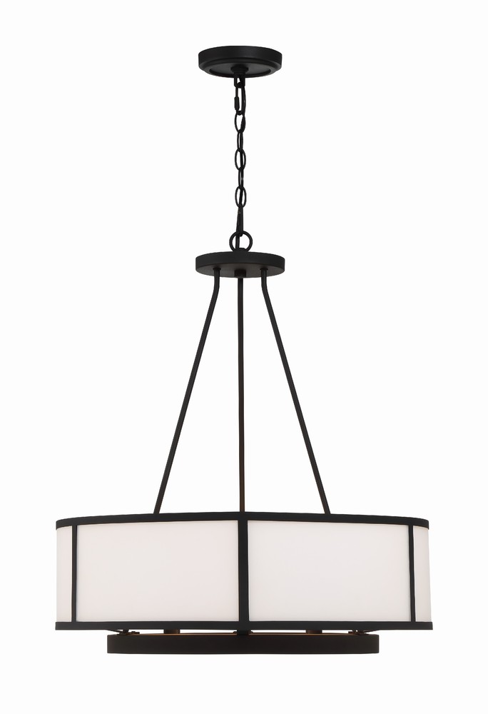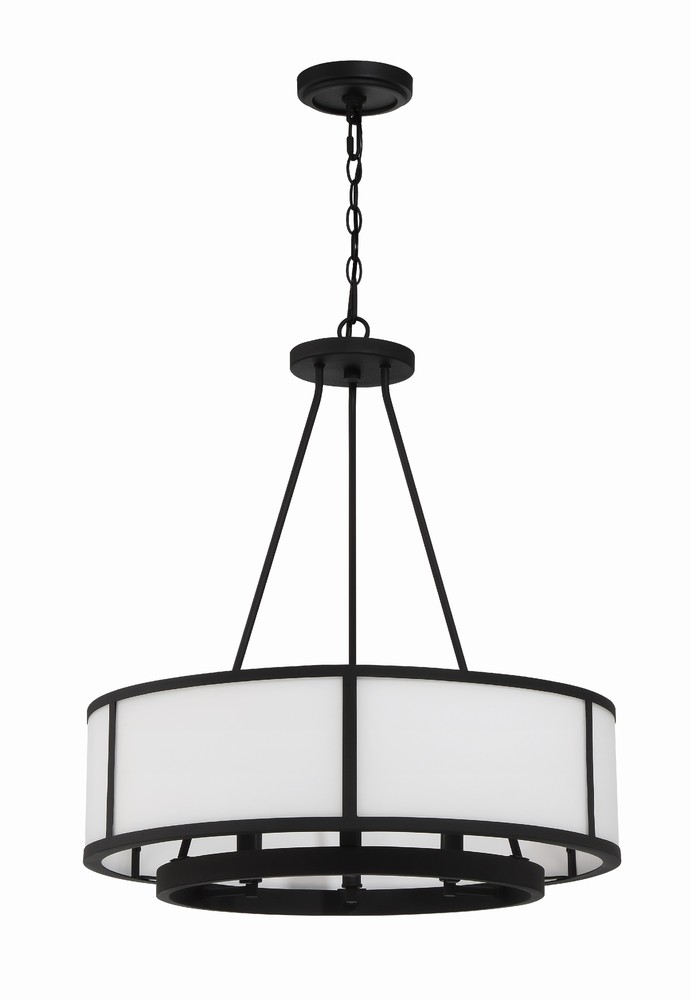 Showcasing a classic drum pendant, the Bryant is crafted with a white glass shade and black steel frame. The outer drum surrounds an inner suspension of candelabra sockets. The contrasting materials and bold graphic lines provide a design-driven style and a striking visual accent to many interior settings.
