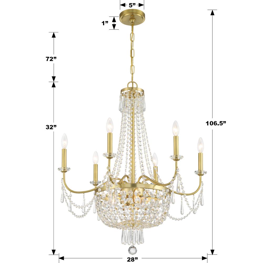 The Haywood is a luminary collection defined by its timeless elegance and classic empire silhouette. This fixture is a radiant centerpiece that adds a touch of luxury to any space. The Haywood's defining feature is its cascading crystal accents, which create a captivating display of light and sparkle. Its upward-sweeping arms, adorned with strands of faceted cut crystal jewels, create an enchanting ambiance. Each decorated with unique charm, the bobeches add a layer of sophistication to this stunning chandelier.