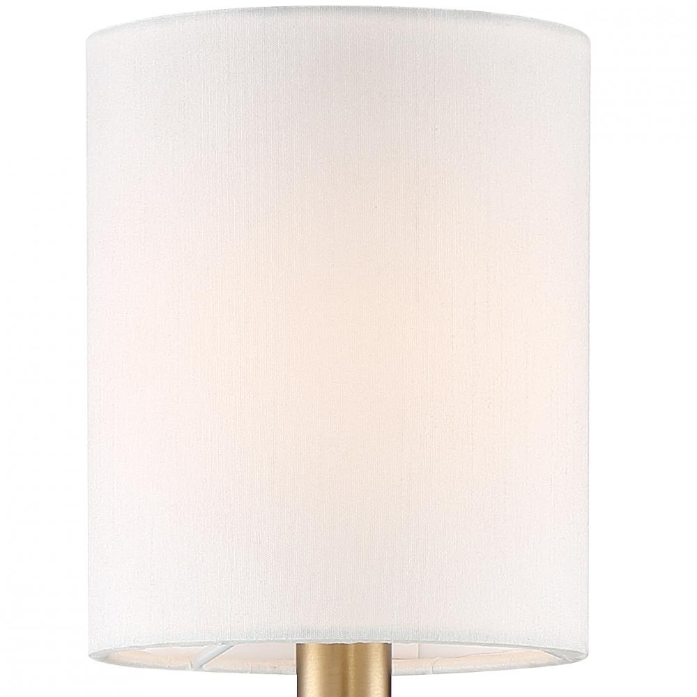The Lloyd fixture's versatile sophistication can be incorporated in all decors-bathroom, hallway, bedroom, and dining room. It features a square beveled backplate and cylindrical white silk shade offers a diffused ambiance that adds a sense of refinement and sophistication to many spaces and décor styles.