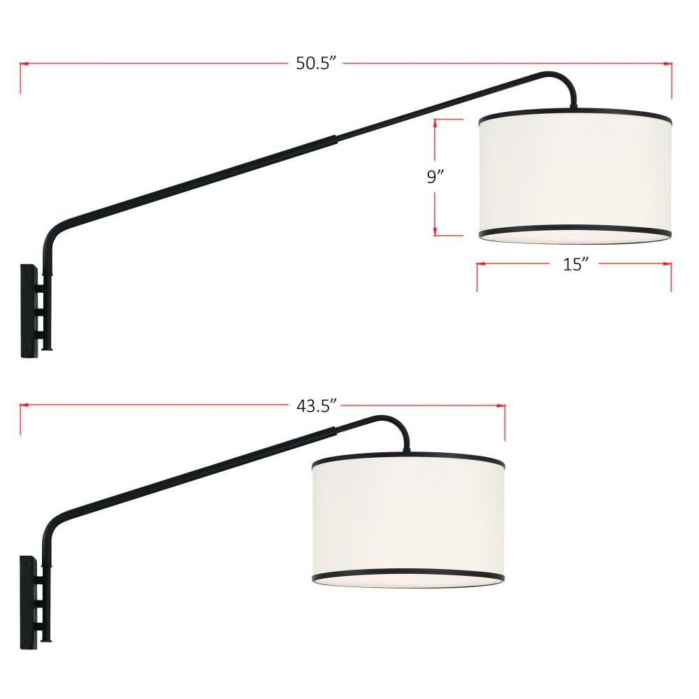 The Mallory swing arm wall sconce is a perfect lighting solution for your bedside to free up table space on your nightstand. Its unique adjustable arm moves left and right and extends inward and outward, giving you the flexibility to direct light exactly where you need it. The rectangular backplate is equipped with a convenient switch, providing easy operation. This sconce is versatile whether you hardwire it for a seamless look or the plug-in option for added convenience. The white shade is beautifully accented with a sleek metal trim and is available in black and gold.
