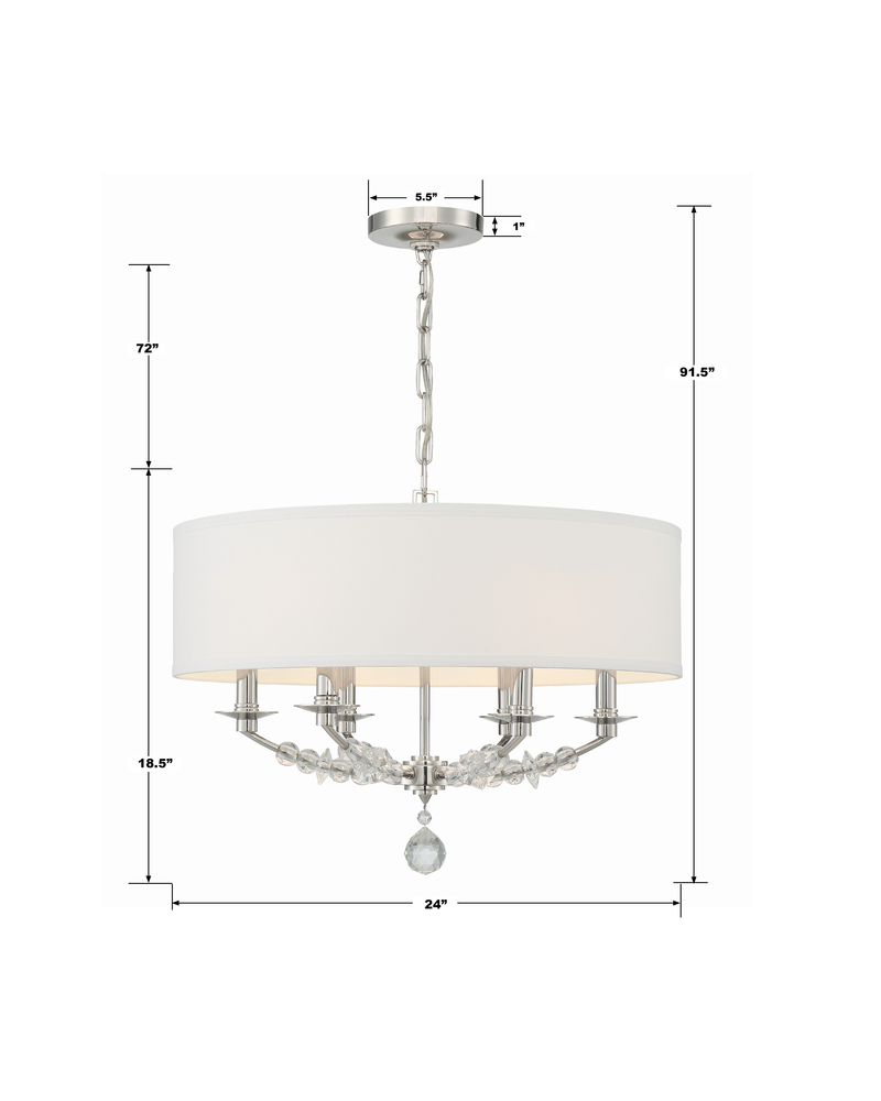 The eye catching design of the Mirage collection features a polished nickel base with arms dressed in faceted oversized crystal beads. The crisp white silk shade atop the candelabra bulbs exuding soft, ambient glow that is perfect for a contemporary appeal. Stylish, modern and minimal, the Mirage brings luxurious appeal to a variety of interior spaces.
