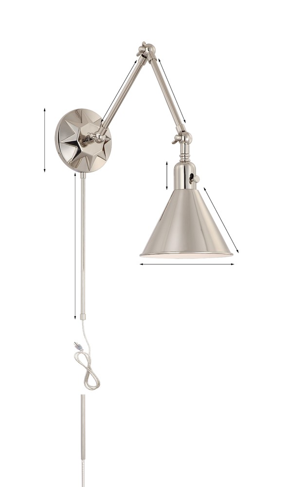 This articulated swing arm fixture is powered by a dimmable switch to adjust desired brightness. Capable of being dimmed with compatible dimmable bulbs (not included). Hardwire or plug into your outlet (8 ft electrical cord; Two 12in Metal cord.).